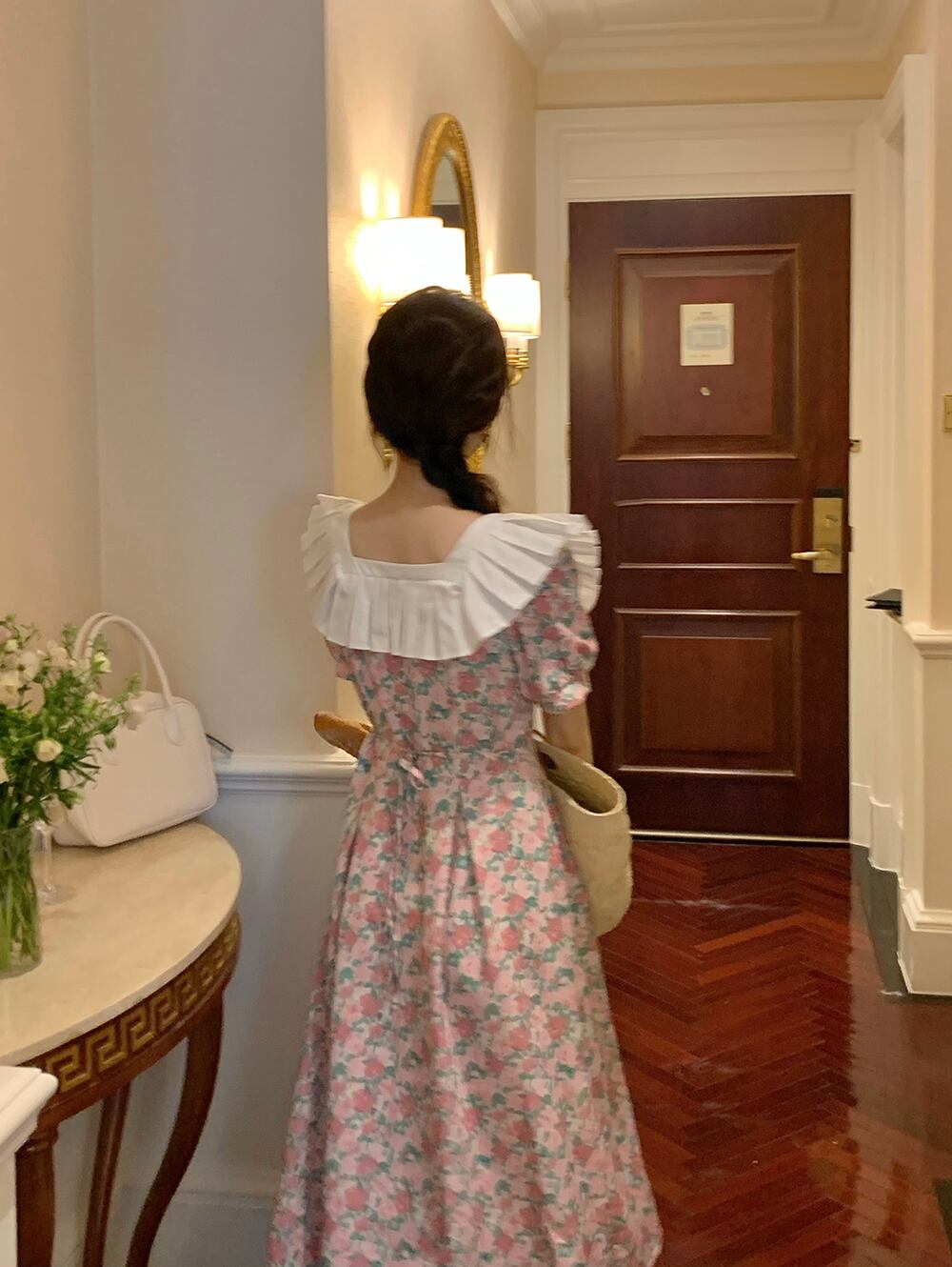 ノミクマウエストフローラルドレスレディースシックフォールドフリルスクエアカラードレスパフスリーブ2022サマーヴェスティドス 夏物 花柄 スクウェア kor3876608894