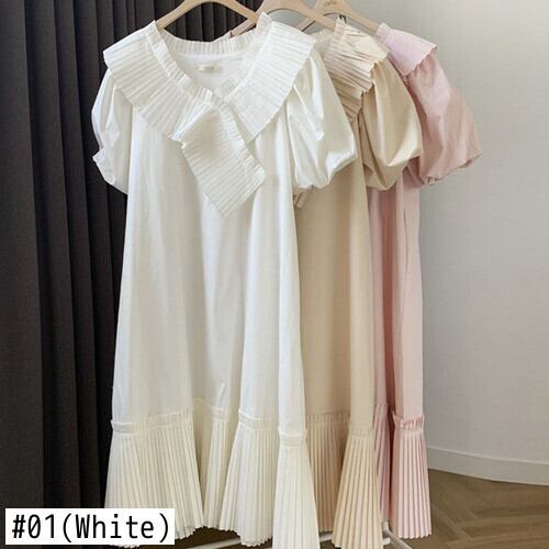 のみくまターンダウンカラープリーツフリルワンピースレディースシックサマードレスカジュアルパフスリーブルーズウエストVestidos 夏物 kor61591167651