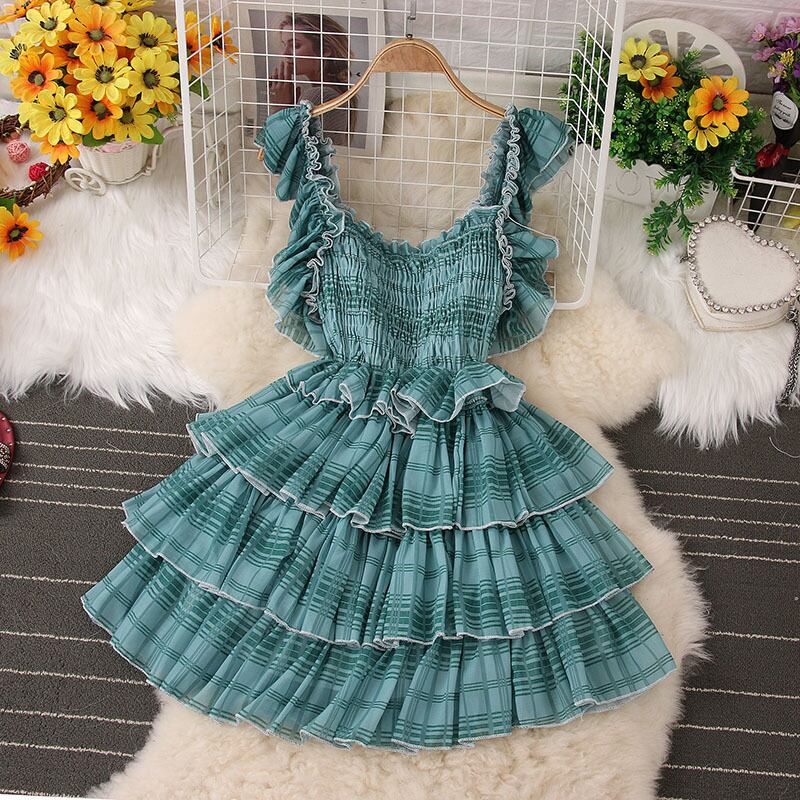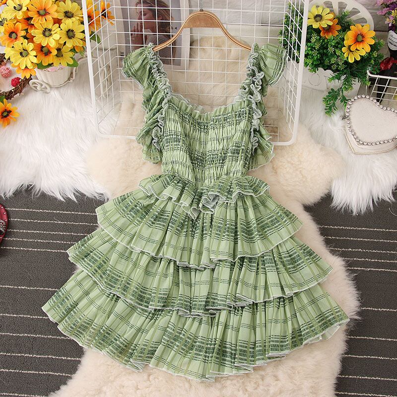 ノミクマ2022サマーウーマンケーキドレスチェック柄レイヤードフリルスパゲッティストラップワンピースウエストカジュアルAラインミニヴェスティドス 夏物 kor59974141352