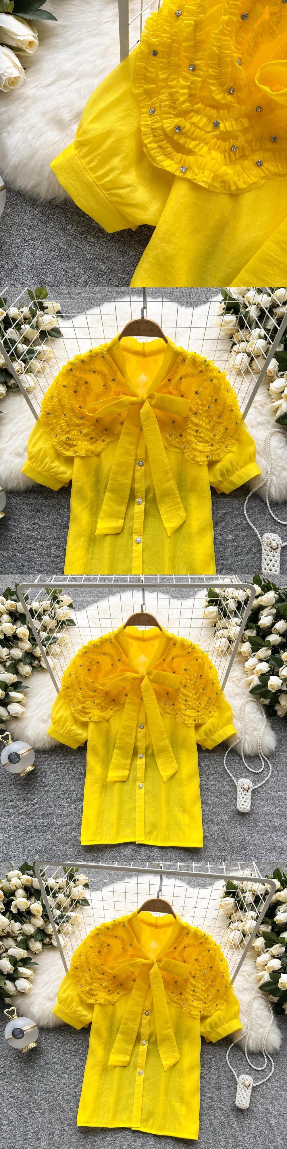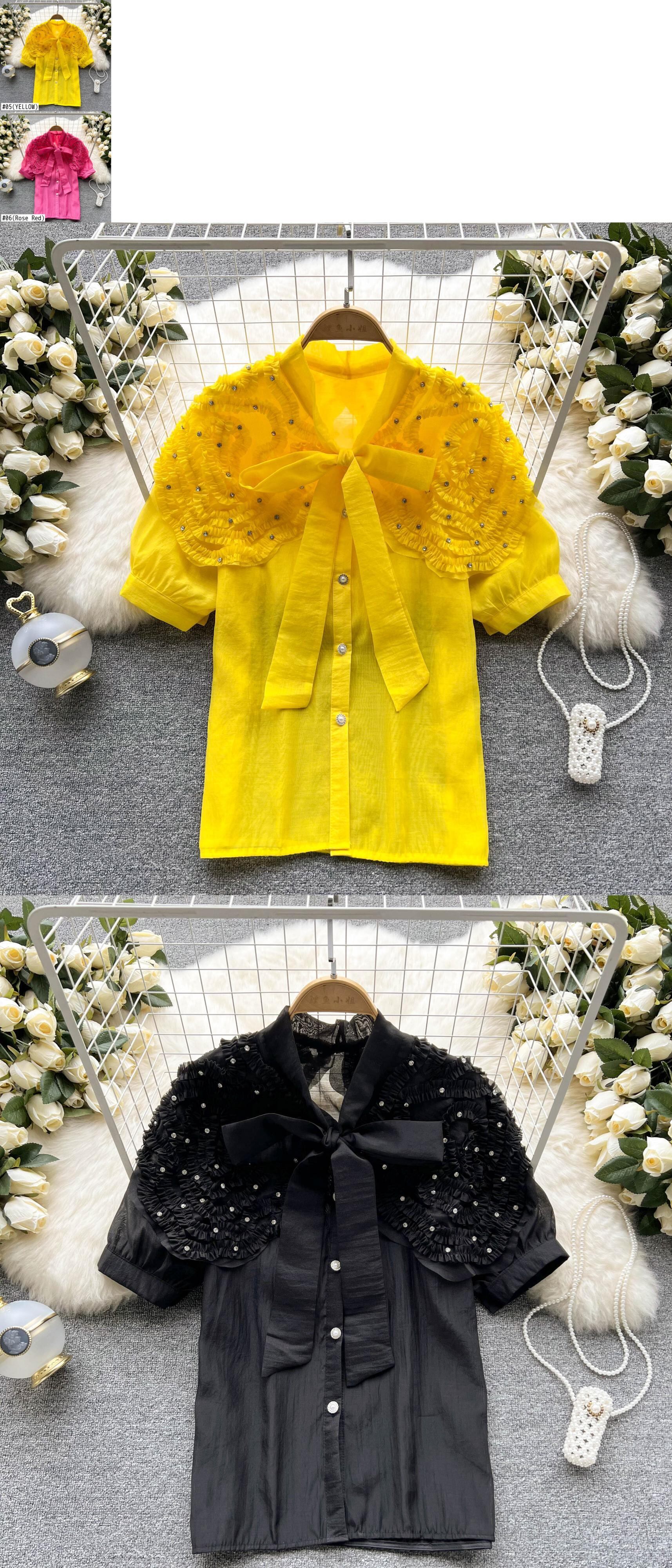 ノミクマダイアモンドフォールドフリルパッチワークブラウストップコーザルパフスリーブボウタイスタンドネックレディーストップコーザルシャツ リボン kor92414703089