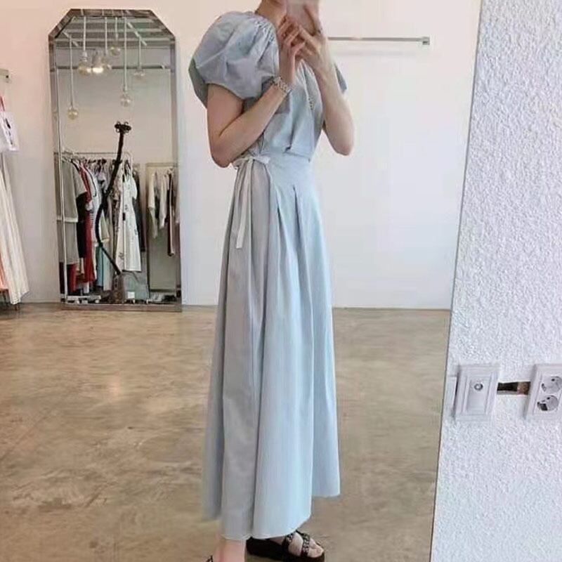 ノミクマフォールドOネックパフスリーブドレスレディースシック2022サマードレス蝶ネクタイスリムウエストAラインVestidos リボン 夏物 kor92809572314