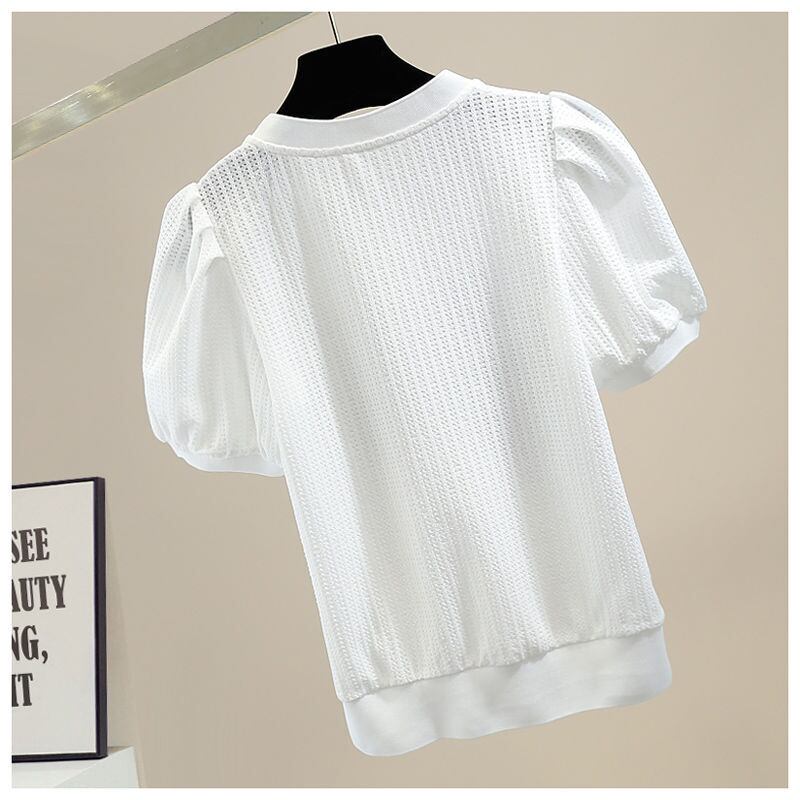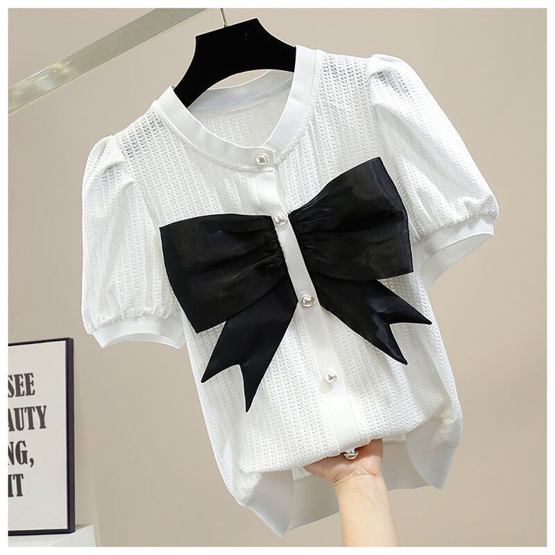 ノミクマヒットカラー3DボウノットレディーストップスシックパフスリーブOネックブラウスシャツ2022SummerDe リボン サマー 夏物 kor10361675667