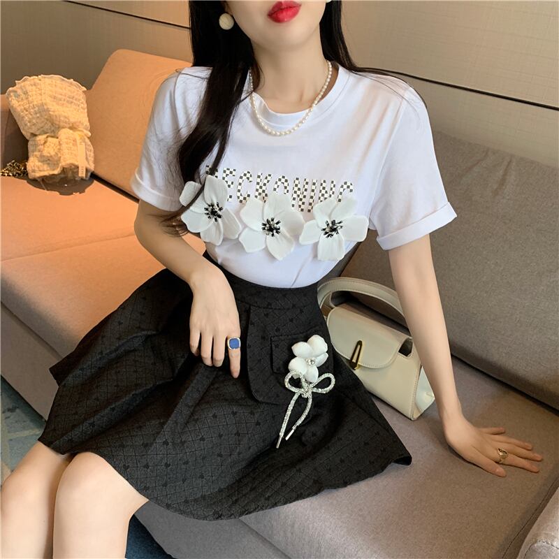 ノミクマ2022夏半袖女性Tシャツシックな3DフラワーレターグラフィックTシャツ因果半袖Oネックトップス ショート ハーフスリーブ サマー 夏物 フラワーデザイン kor9420646921