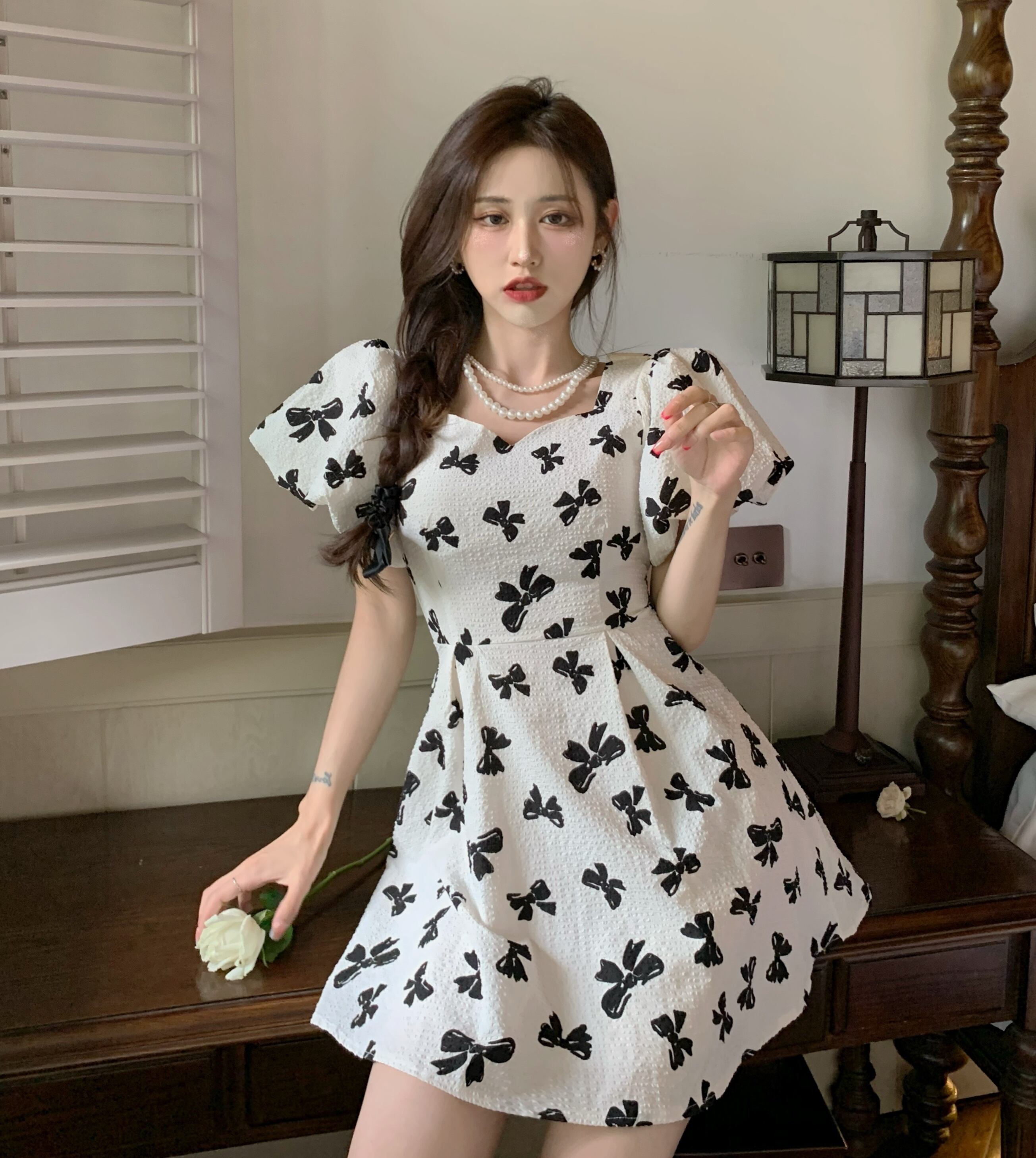 のみくまバタフライプリントウーマンドレスシックなスクエアカラーパフスリーブボウ包帯スリムウエストドレス リボン スクウェア kor6221742782