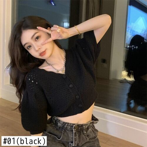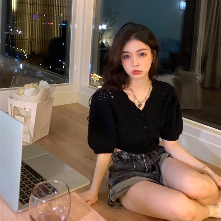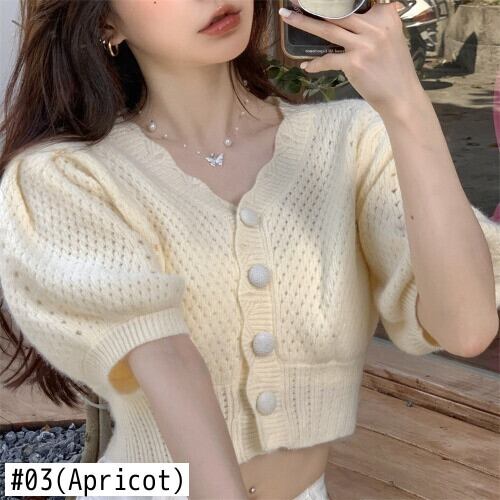 ノミクマパフスリーブニットレディース2022サマーショートニットカーディガンシックなVネックスウィートセーターコート 大人ガーリー キュート カジュアル 夏物 kor13646719284