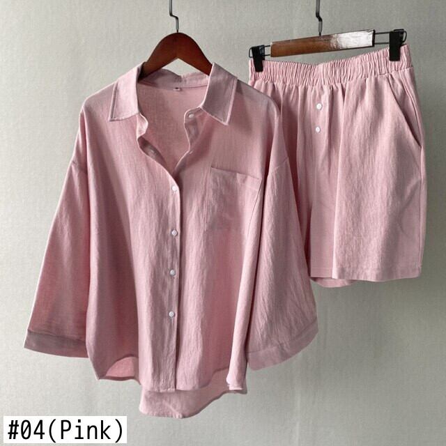 ノミクマレディースツーピースセット2022コットンリネンブラウススーツ長袖ターンダウンカラートップス+ウエストワイドレッグショーツ ロング ブルマー ワイドパンツ kor34730459870