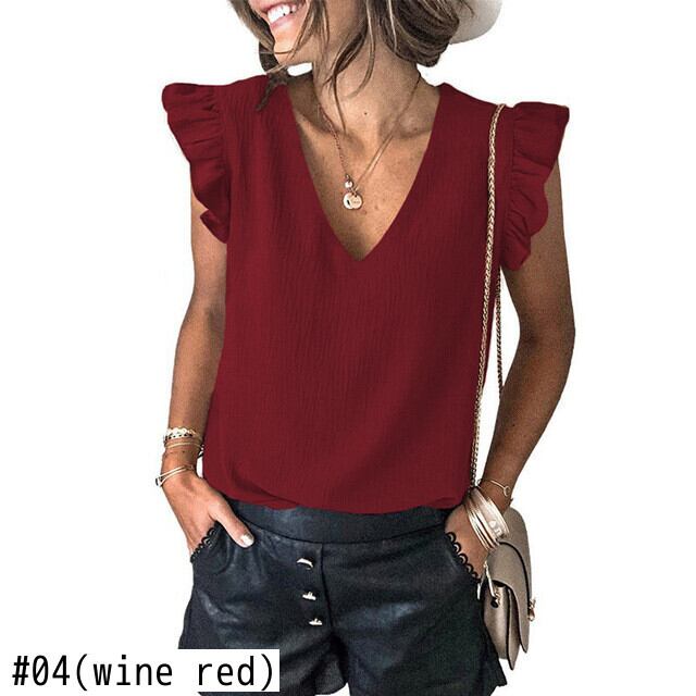 ノミクマソリッドVネックフリルノースリーブレディーストップ2022サマーコーザルTシャツスタイルグラフィックTシャツ 夏物 ソリッドカラー kor64935482741