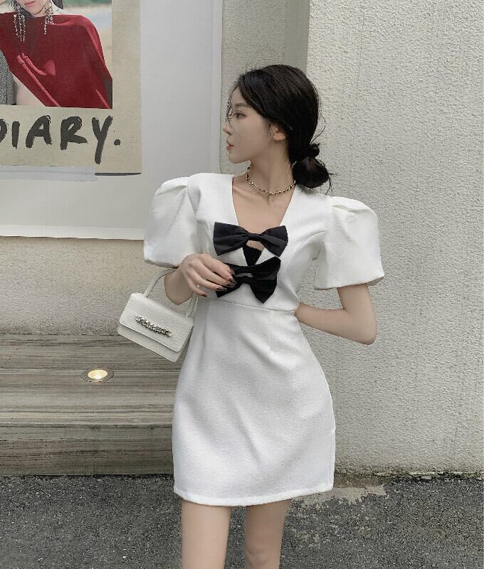 ノミクマパフスリーブドレスレディースサマーシックヒットカラーボウノットVネックワンピース2022スリムウエストAラインミニヴェスティドス リボン 夏物 kor34434912263