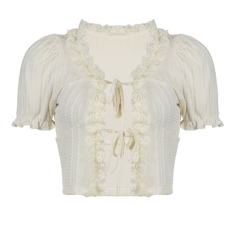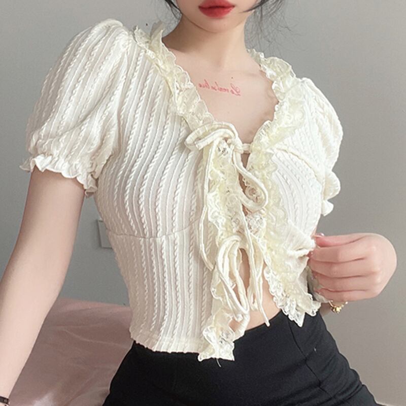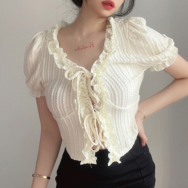 のみくまシックレースフリルパッチワークブラウスレースアップスリムショートニットトップ2022サマーパフスリーブセクシークロップシャツ 夏物 kor23810999032
