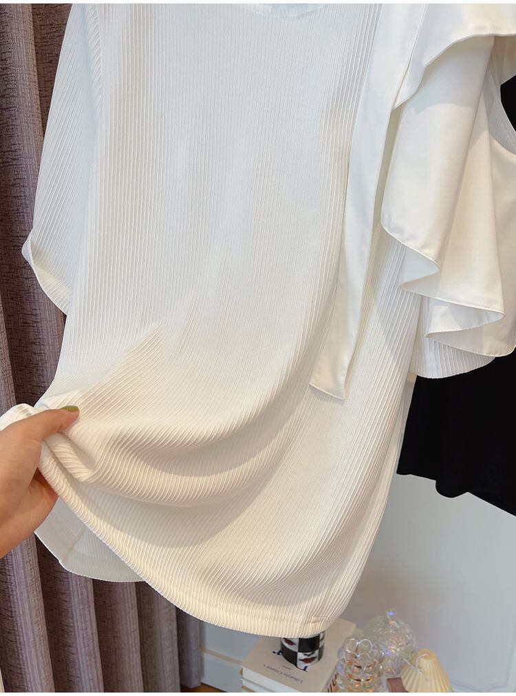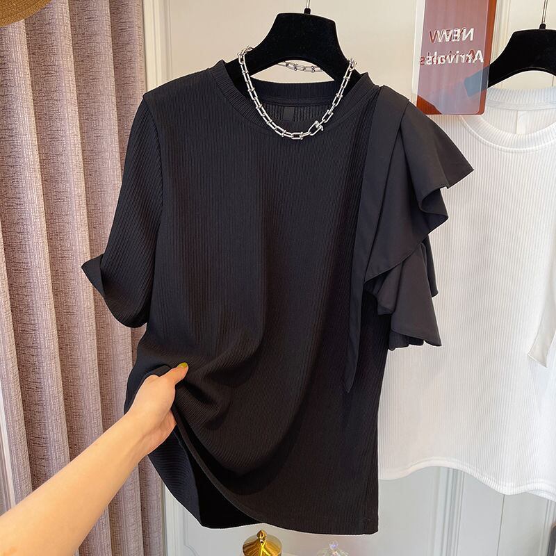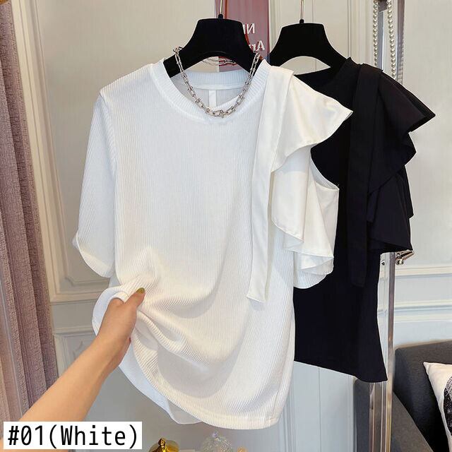 ノミクマシックフリル半袖女性TシャツサマーグラフィックTシャツOネックプルオーバーTシャツトップス ショート ハーフスリーブ 夏物 ソリッドカラー kor44407170386