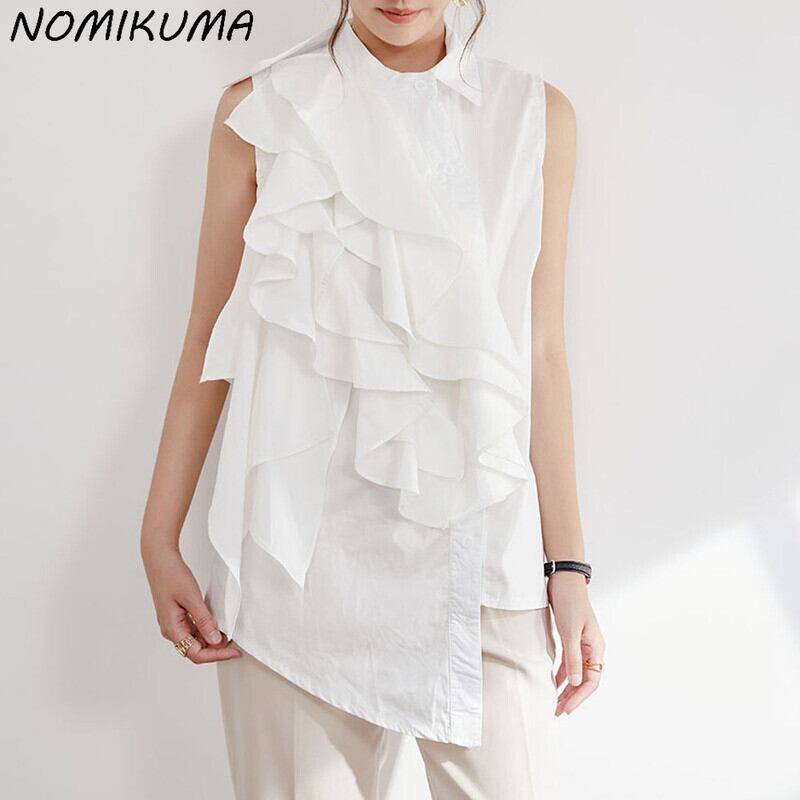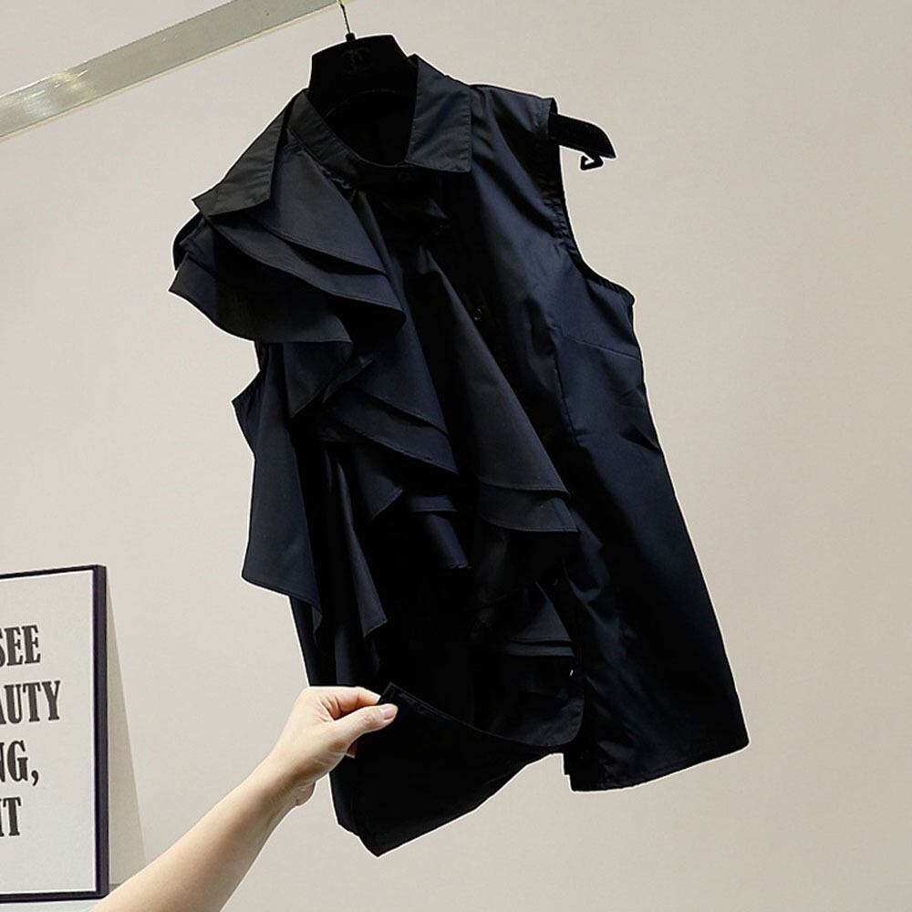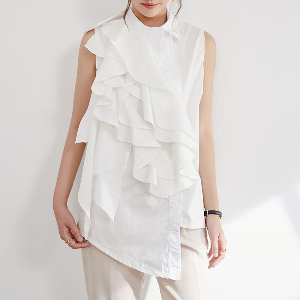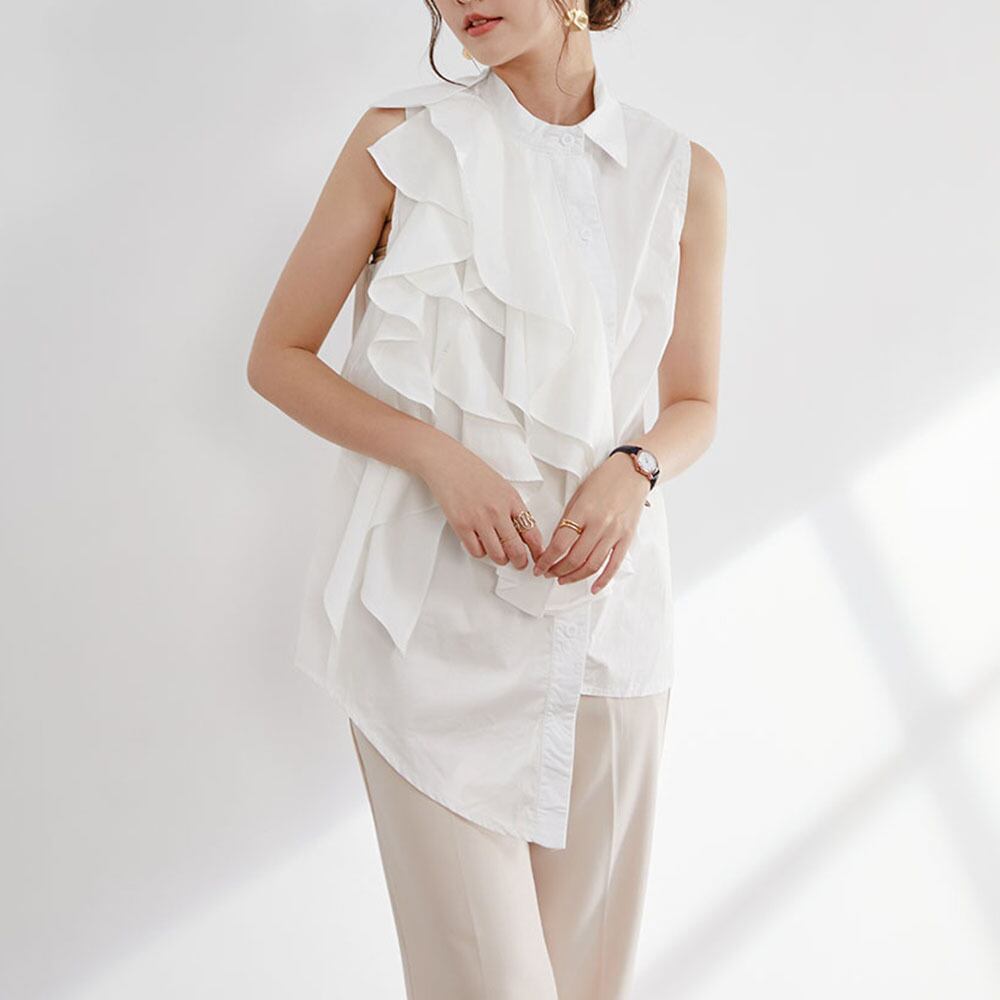 のみくまイレギュラーフリルレディースシャツCausalノースリーブターンダウンカラーブラウス2022夏 サマー 夏物 kor68129565643