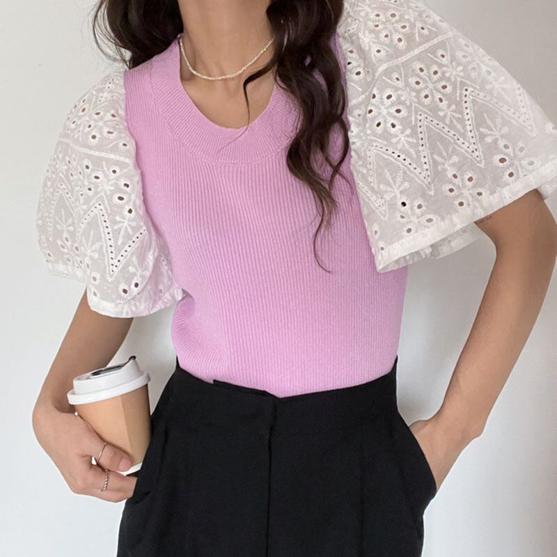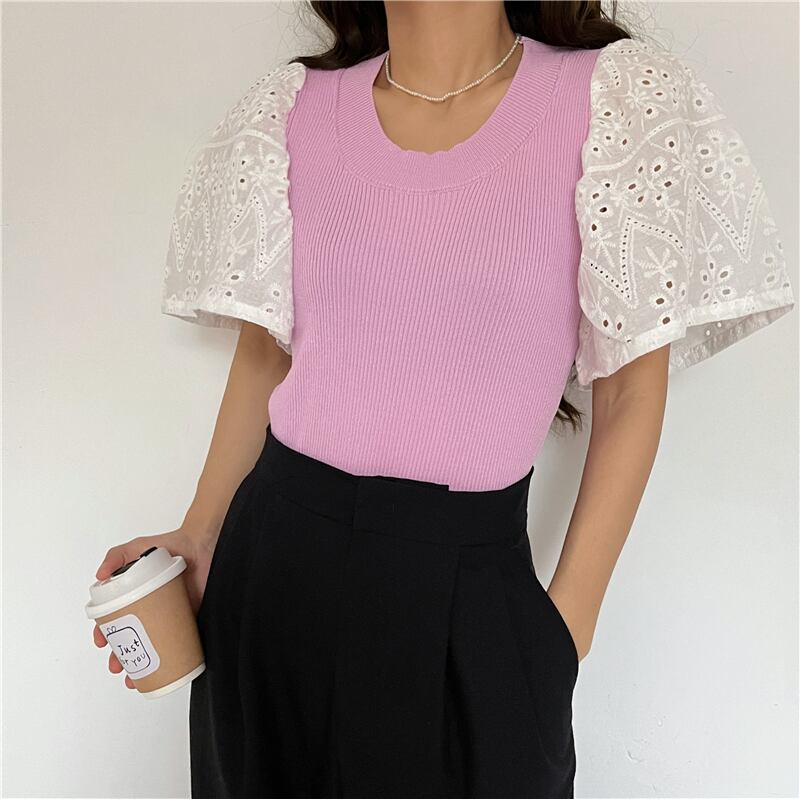 ノミクマサマーウーマンセーターCausalHookHoolow-outフレアスリーブパッチワークニット2022スリムプルオーバーニットトップス 夏物 kor50111616129