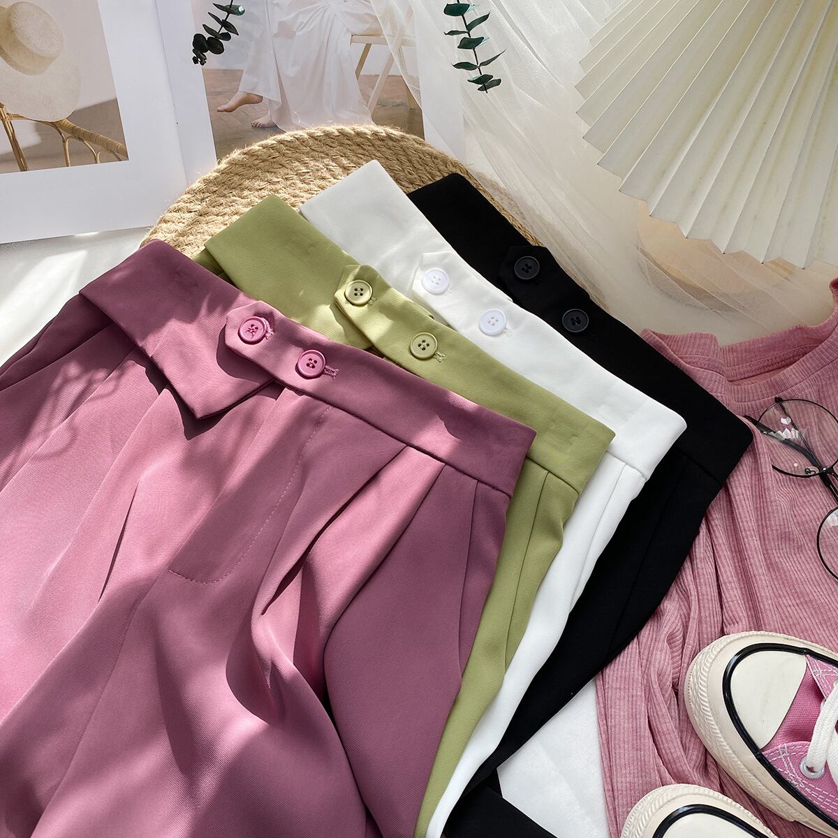のみくまウエストスーツ膝丈パンツサマーウィメンズパンツワイドレッグハーフパンツ 夏物 ワイドパンツ ソリッドカラー kor636704966