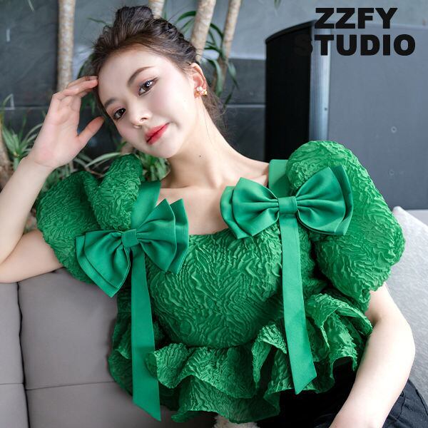 ノミクマ2022サマーブラウスレディースシックボウノットパフスリーブトップシャツスウィートパフスリーブスリムウエストショートデ リボン 大人ガーリー キュート カジュアル 夏物 kor78746260012