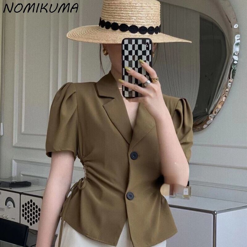 ノミクマドローストリングホローアウトスリムウエストブレザーコート2022サマーパフスリーブターンダウンカラーブレザー 夏物 kor28776661317