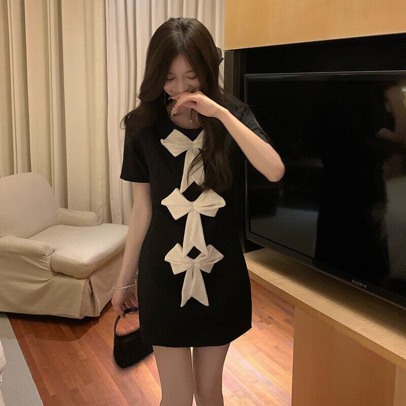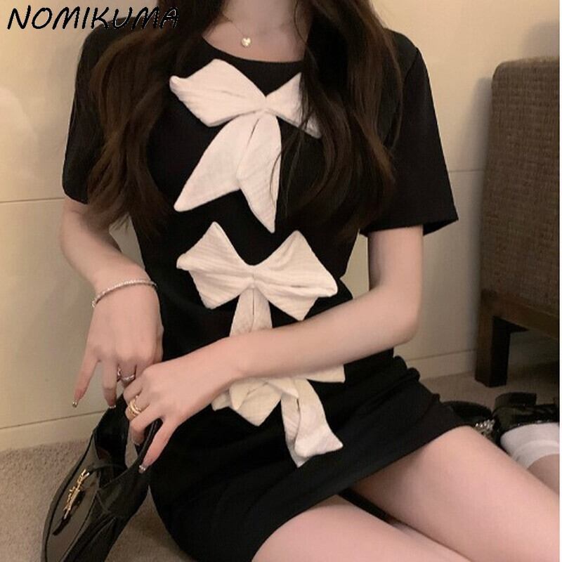 のみくまシックヒットカラー蝶結びウーマンドレス2022年夏半袖OネックVestidosスリムミニドレス ショート リボン ハーフスリーブ サマー 夏物 kor90095634214