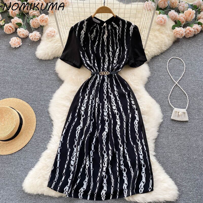 ノミクマ2022サマーウーマンドレスプリントサッシスリムウエストワンピース半袖OネックVestidosDe ショート ハーフスリーブ 夏物 kor4438179940