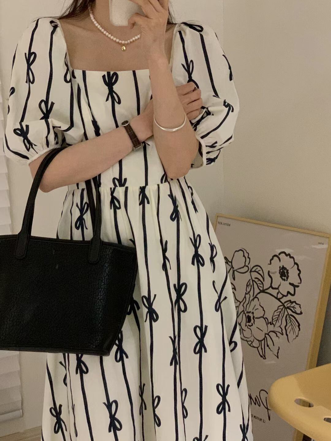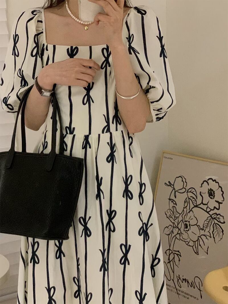 ノミクマボウノットプリントウーマンドレスシックなサマーランタンスリーブスクエアカラーウエストドレス リボン 夏物 スクウェア kor56229275549