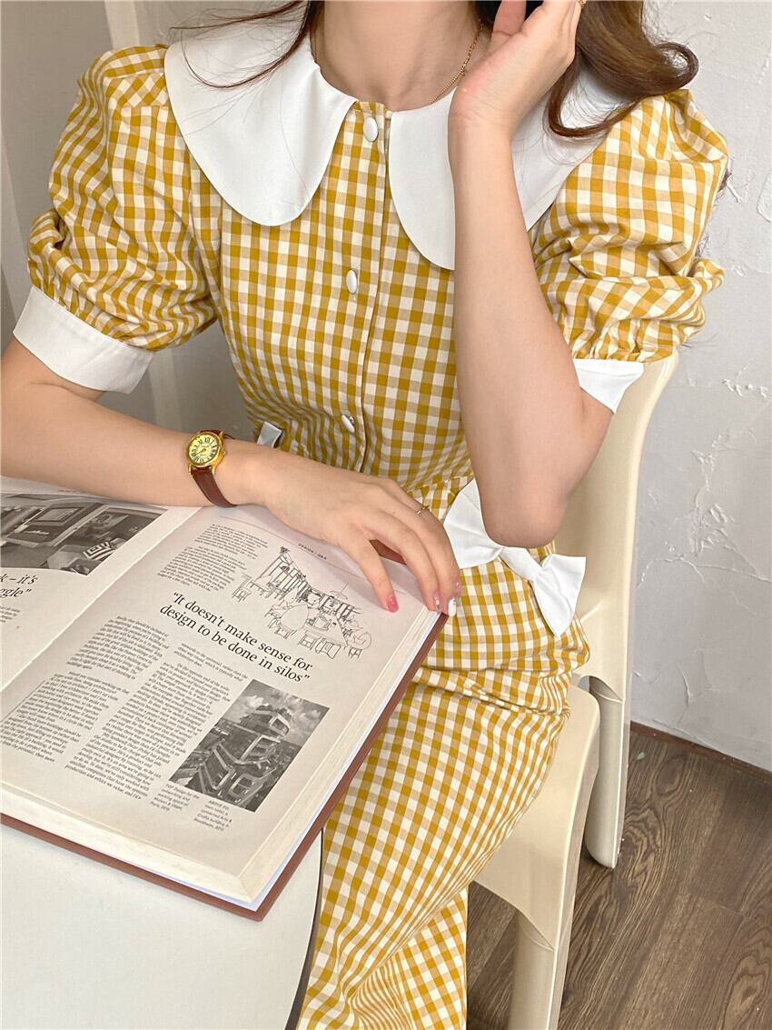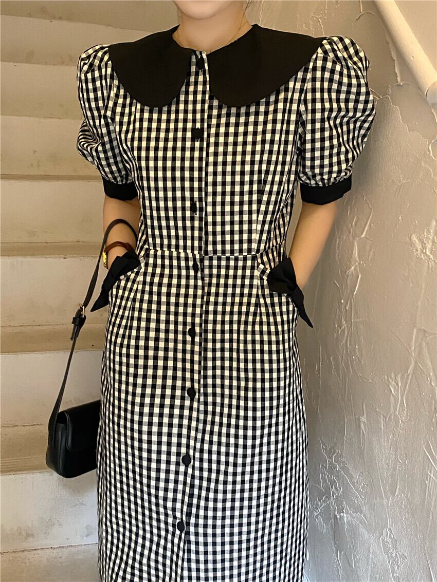 ノミクマチェック柄女性ドレスヒットカラーピーターパンカラードレスサマーシングルブレストパフスリーブVestidos 夏物 kor14434681005