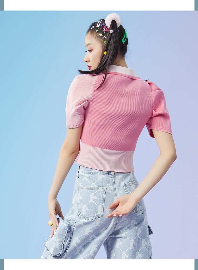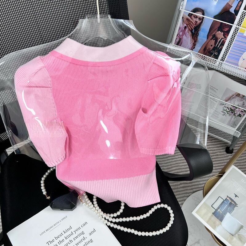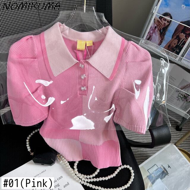 ノミクマスウィートパフスリーブウーマンセーター2022年夏ターンダウンカラープルオーバースウィートスリムショートニットトップス 大人ガーリー キュート カジュアル サマー 夏物 kor80474084113