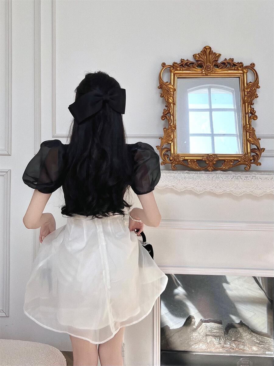 のみくまシックヒットカラー蝶結びガーゼスリムウエストワンピースレディースパフスリーブスクエアカラーワンピース2022サマーヴェスティドス リボン 夏物 ドレス スクウェア kor19744266275