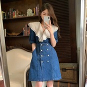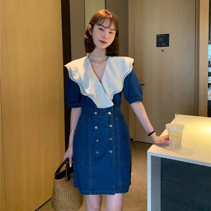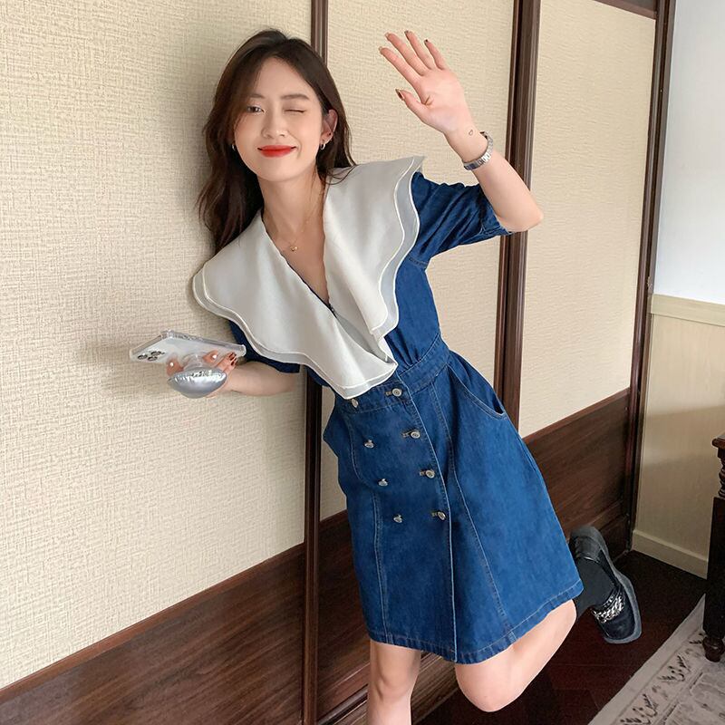 のみくまヒットカラーフリルVネックデミンワンピースレディース半袖2022年夏Vestidoダブルブレストジャンワンピース ショート ハーフスリーブ サマー 夏物 ドレス kor22252602647
