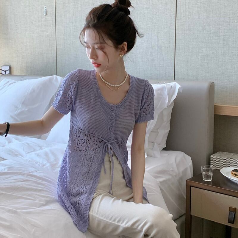 ノミクマサマーニットホローアウトカーディガンレースアップスプリットミディアムロングニット半袖Vネックセーター ショート ハーフスリーブ 夏物 kor32526312856