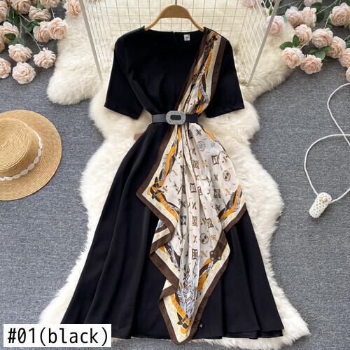 のみくまプリントフリルパッチワークワンピースレディース半袖Oネックワンピースベルトスリムウエストサマーヴェスティドス ショート ハーフスリーブ 夏物 ドレス ハーネス kor63695713344