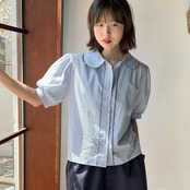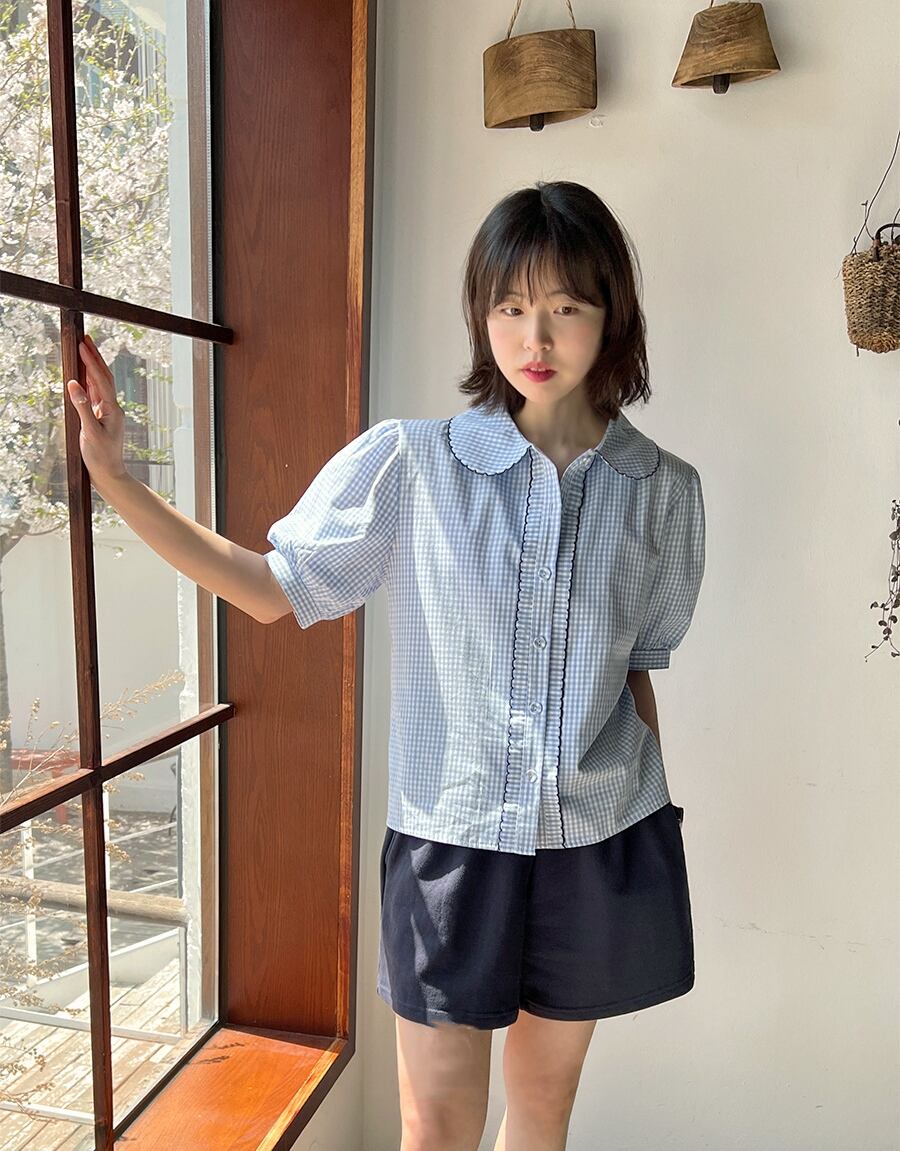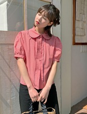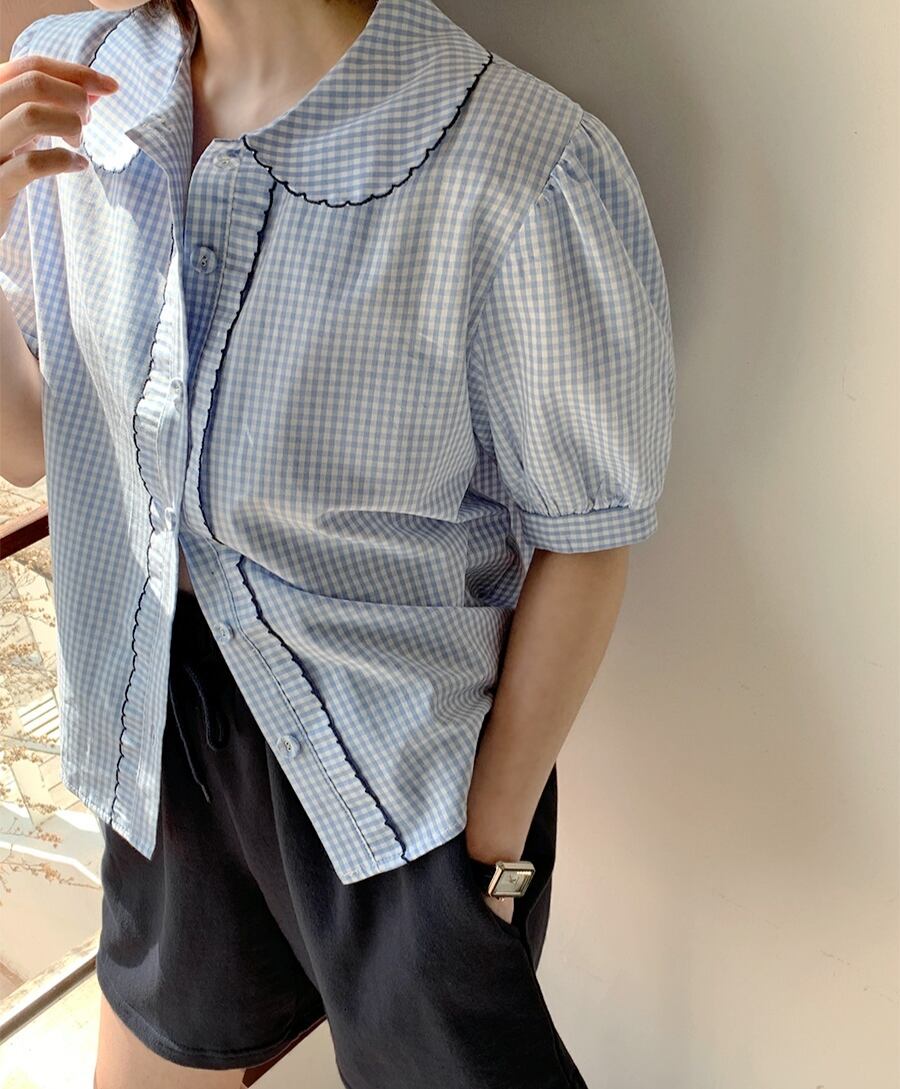ノミクマヒットカラーチェック柄レディースブラウスシックパフスリーブピーターパンカラーシャツサマートップ 大人ガーリー スウィート キュート カジュアル 夏物 kor64014069798