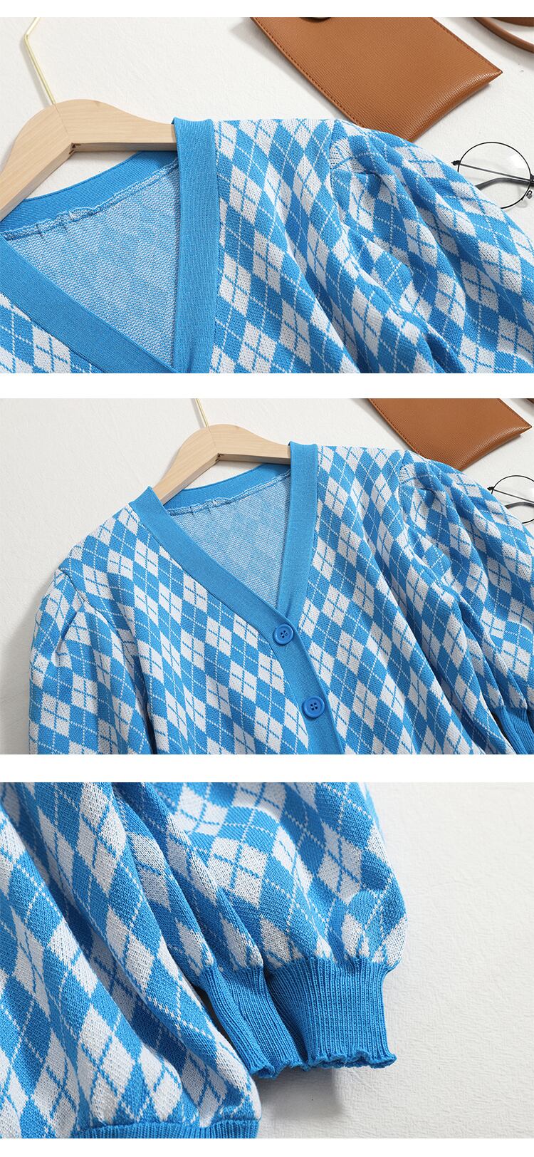 ノミクマシックアーガイルVネックニットトップスレディース2022サマーセーターコートカジュアルパフスリーブカーディガンショートニットジャケット 夏物 kor2238489945