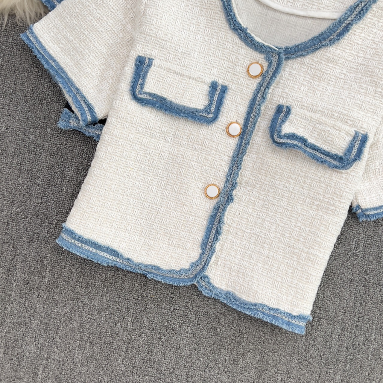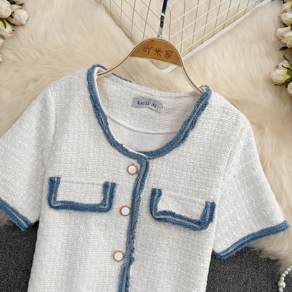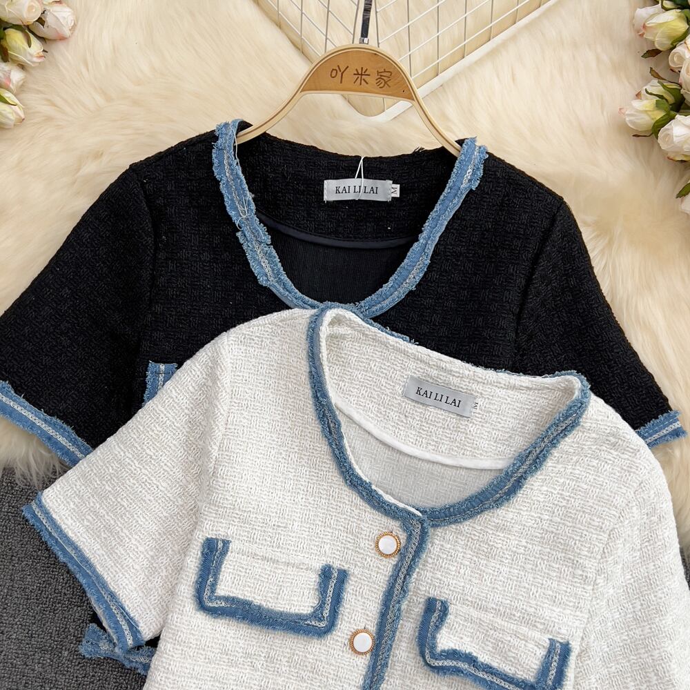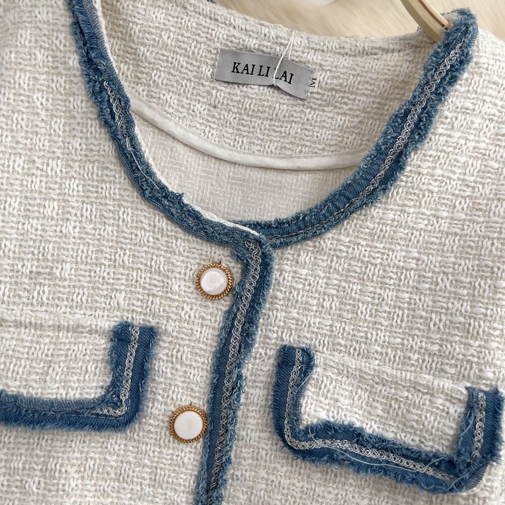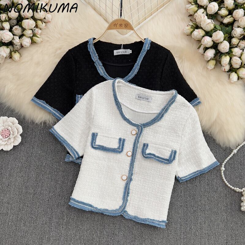 ノミクマコントラストカラーツイードショートコートレディース2022サマージャケットカジュアルシングルブレストVネックアウトウェアトップス 夏物 kor52111943094
