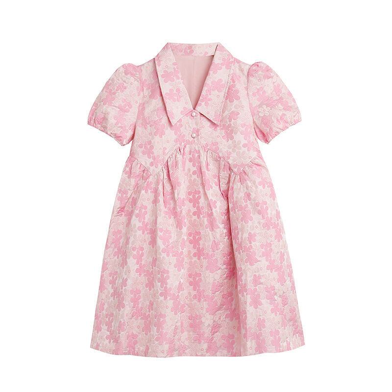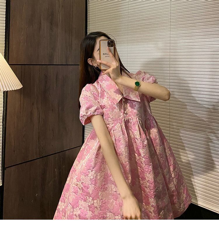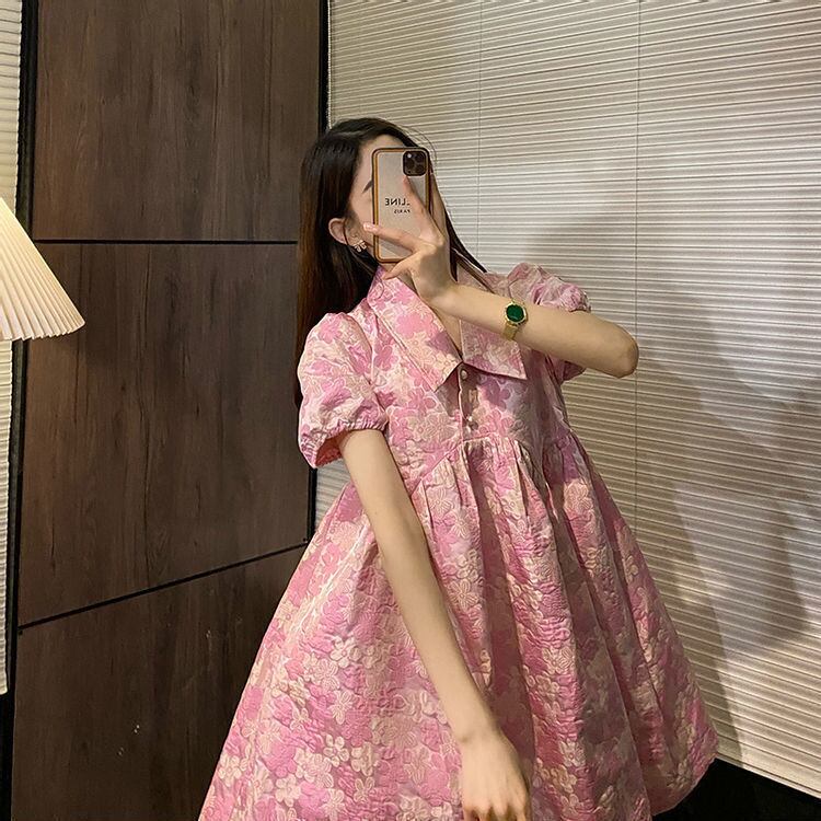 ノミクマピンクジャカードドレス女性2022年夏の不規則なウエストドレスシックなスウィートパフスリーブターンダウンカラーVestidos 大人ガーリー キュート カジュアル サマー 夏物 kor21984912258