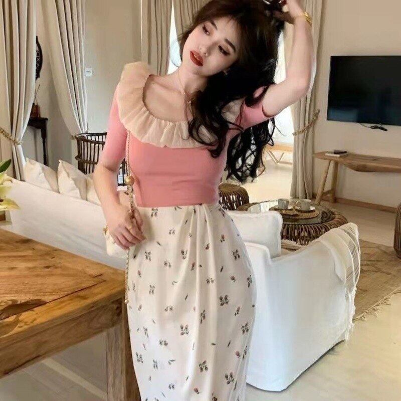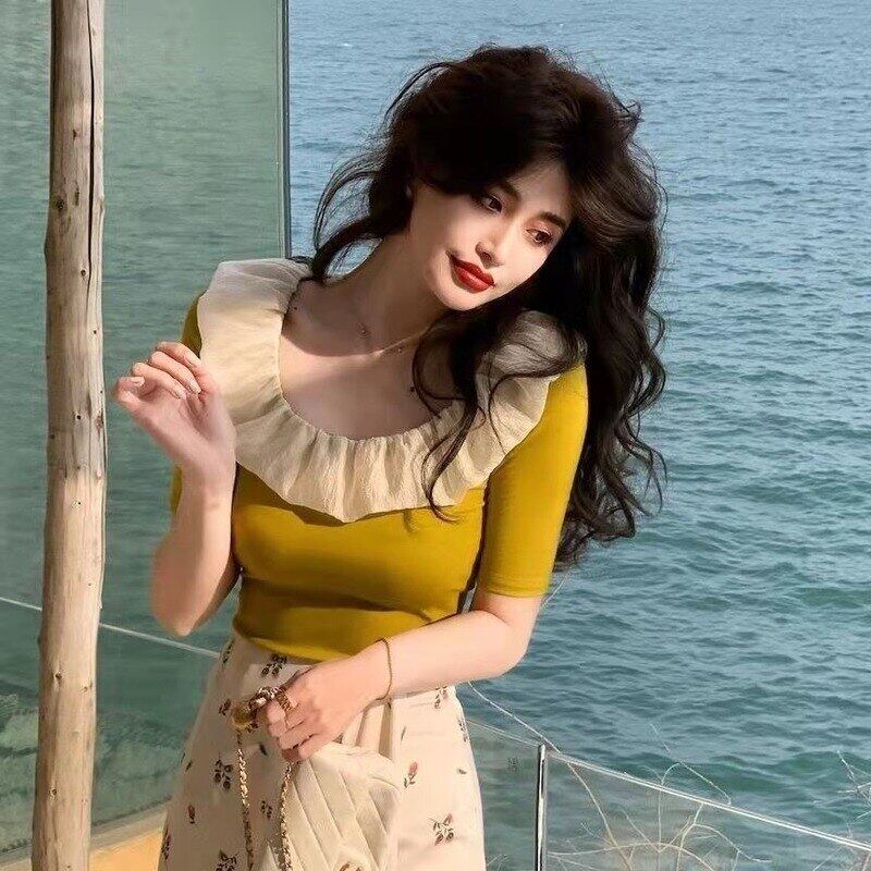 ノミクマ2022サマーニットトップシックヒットカラーフリルパッチワークOネックプルオーバーニットカジュアル半袖スリムセーター ショート ハーフスリーブ 夏物 kor4156246656