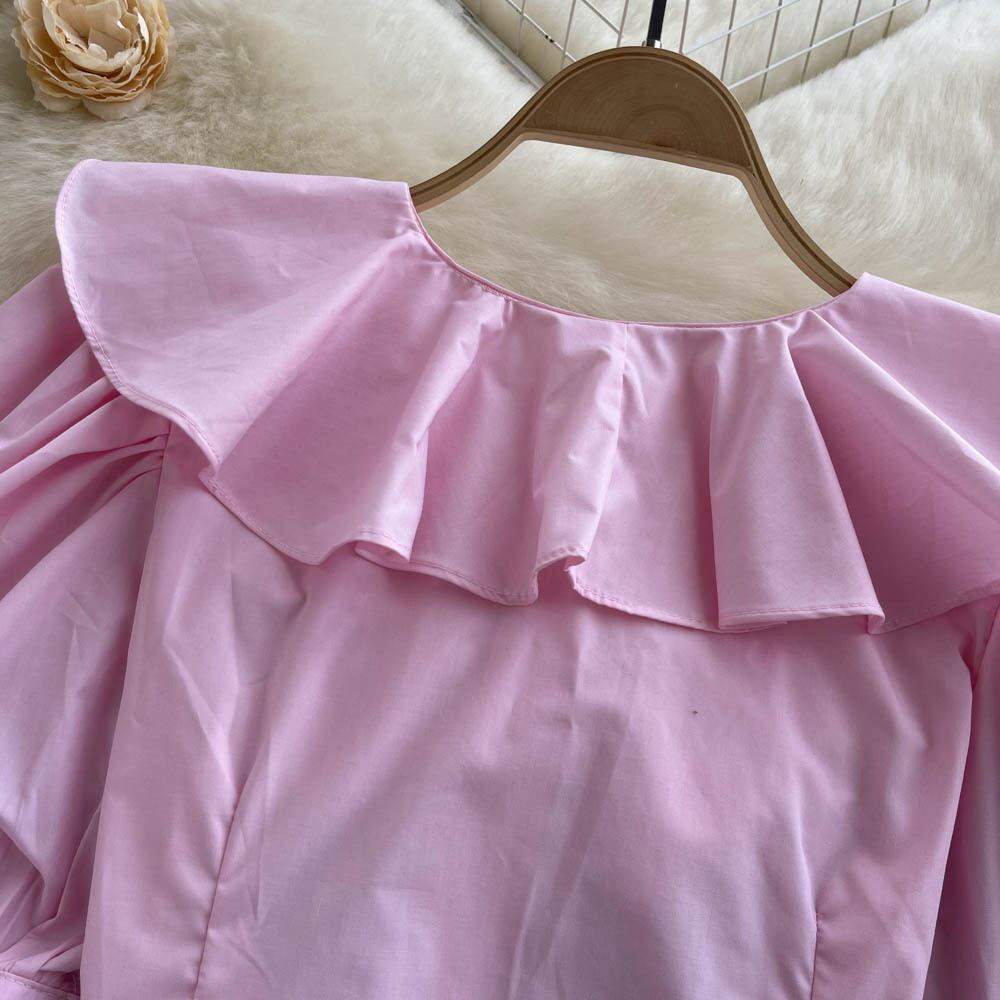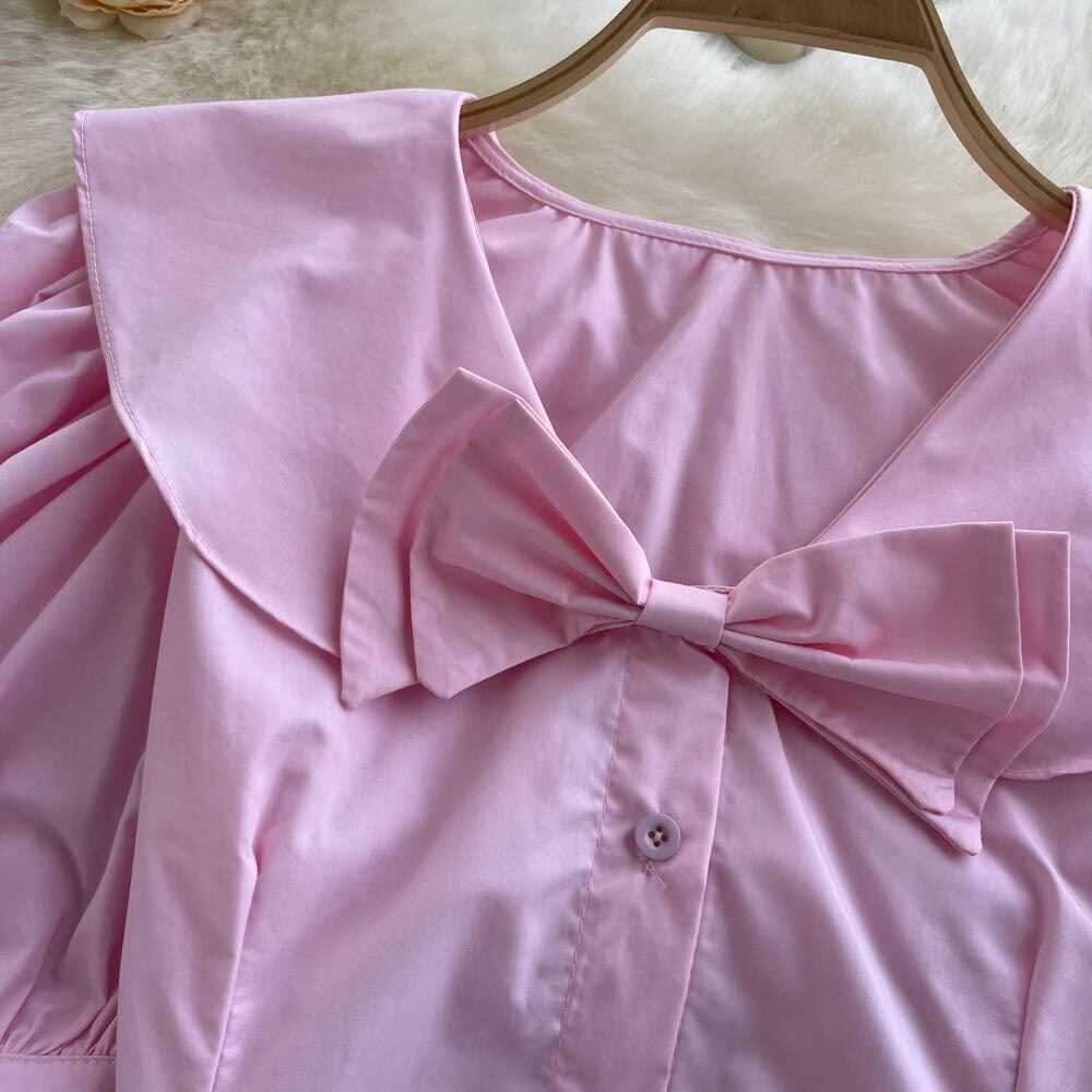 ノミクマピーターパンカラーボウノットブラウス女性2022サマードールシャツスウィートパフスリーブスリムショートシックトップス リボン 大人ガーリー キュート カジュアル 夏物 kor74543928411