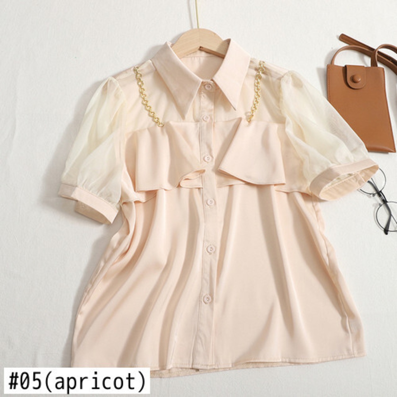 ノミクマサテンブラウス女性2022年サマーチェーンフリルパッチワークシャツCausalPuffスリーブフェミニモ 夏物 kor15851543978