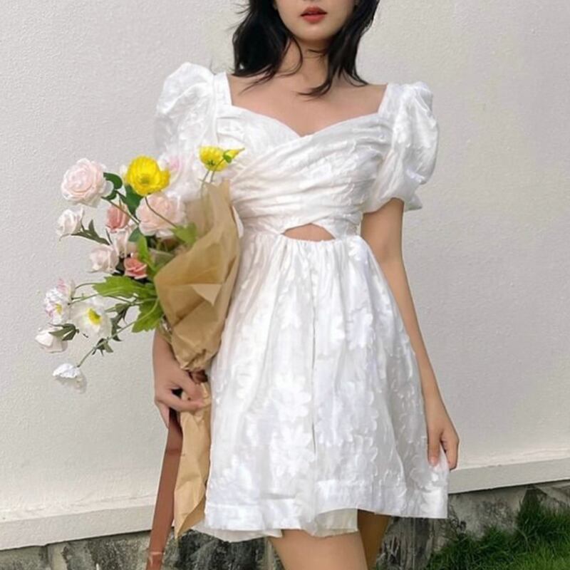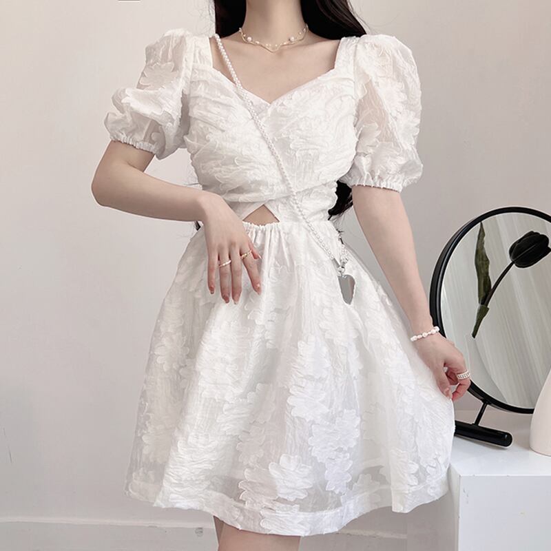 のみくまスウィートスクエアカラージャカードウーマンドレスパフスリーブスリムウエストくり抜きVestidosサマーAラインドレス 大人ガーリー キュート カジュアル 夏物 スクウェア kor84096310012