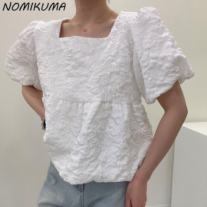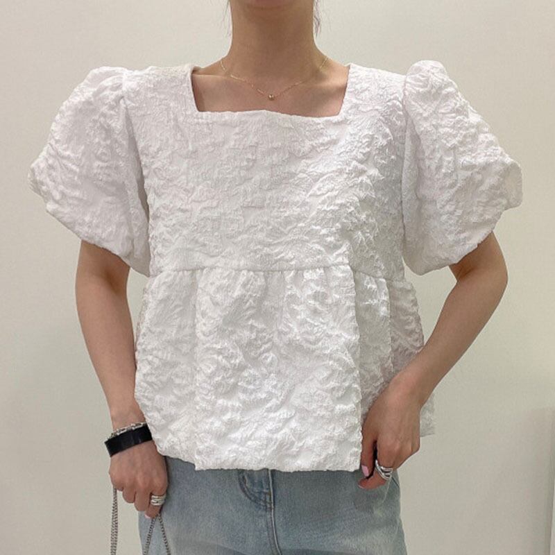 のみくまスウィートスクエアカラーパフスリーブレディースドールシャツシックサマーブラウストップス2022WiastRuffle Short ショート 大人ガーリー キュート カジュアル 夏物 スクウェア kor55698355053
