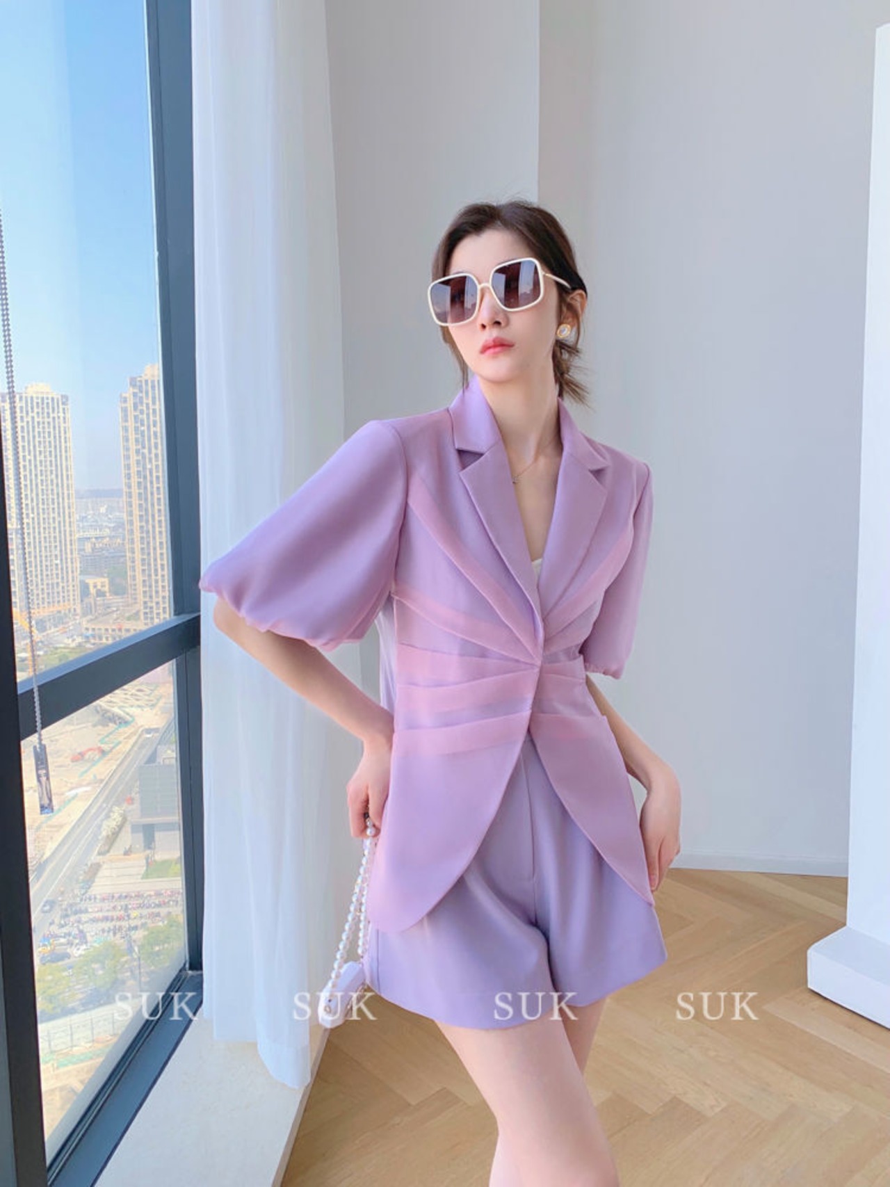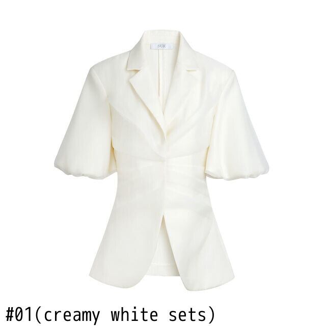 ノミクマ2022夏の女性セットシックなガーゼパフスリーブノッチ付きカラーブレザーコート+ウエストショーツツーピーススーツ サマー 夏物 ブルマー kor47823330405