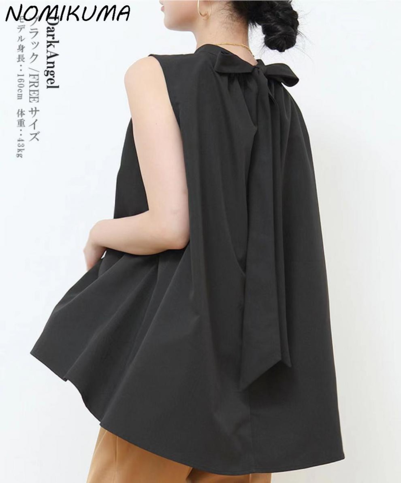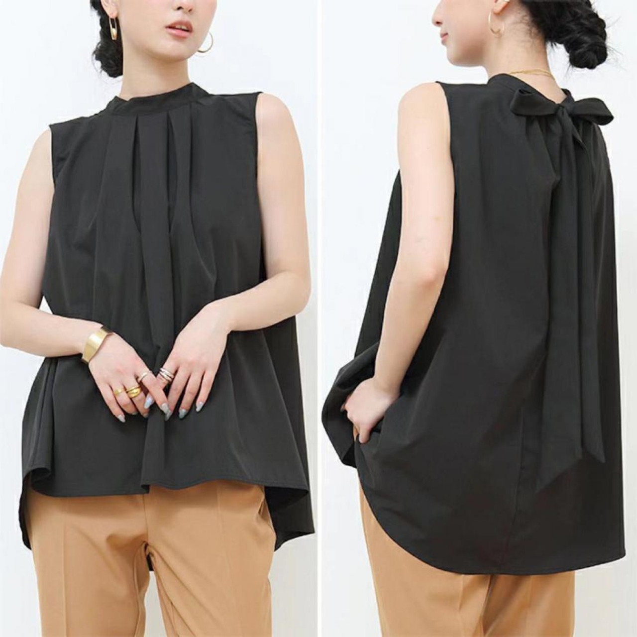 KUSAHIKIスウィートボウ包帯スタンドネック女性ブラウス因果ノースリーブソリッドシックドールシャツ2022夏 リボン 大人ガーリー キュート カジュアル サマー 夏物 ソリッドカラー kor2026400465