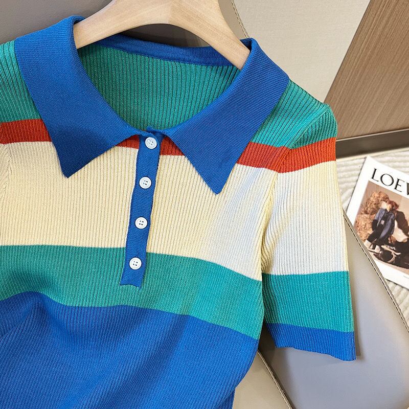ノミクマヒットカラーストライプニットトップス2022夏半袖ターンダウンカラープルオーバーレディースニットセーター ショート ハーフスリーブ サマー 夏物 kor84305841892