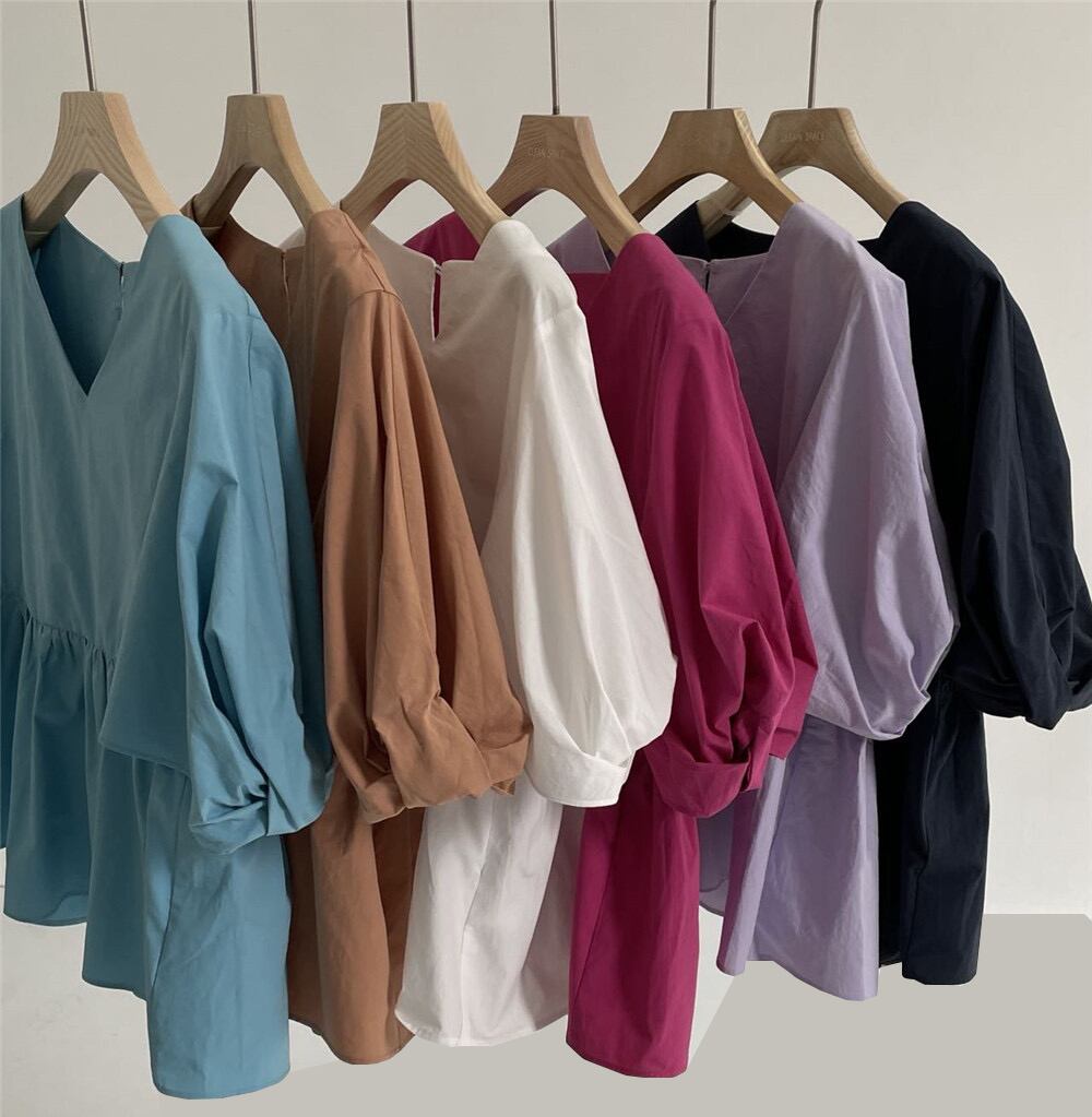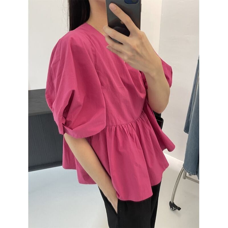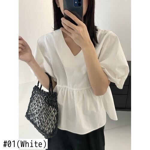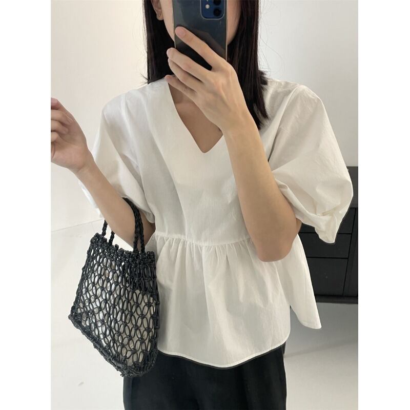 のみくまスウィートツイストパフスリーブウーマンシャツCausalVネックシックソリッドブラウス2022SummerDe 大人ガーリー キュート カジュアル サマー 夏物 ソリッドカラー kor9150746706