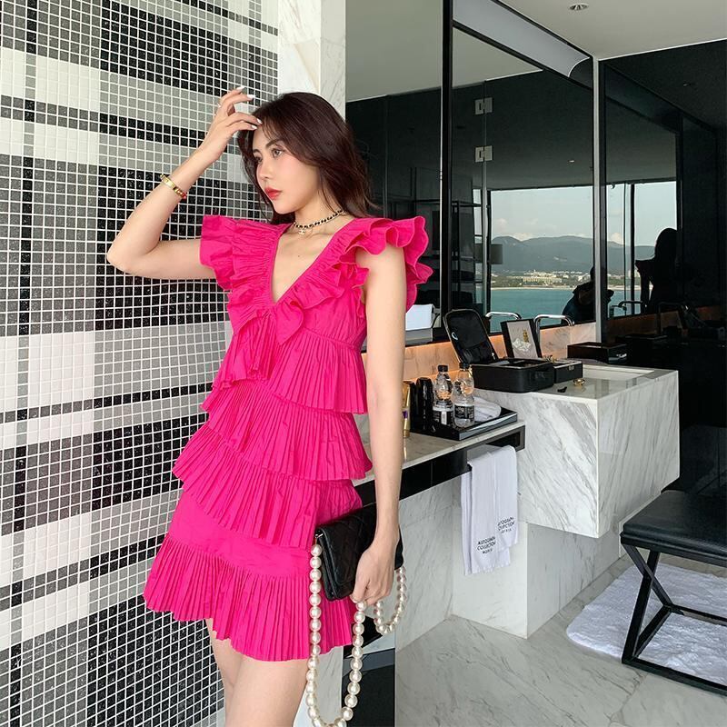 ノミクマシックフォールドフライングスリーブVネックウーマンドレスシックレイヤードフリルAラインワンピース2022SummerVestido De サマー 夏物 kor16762493733