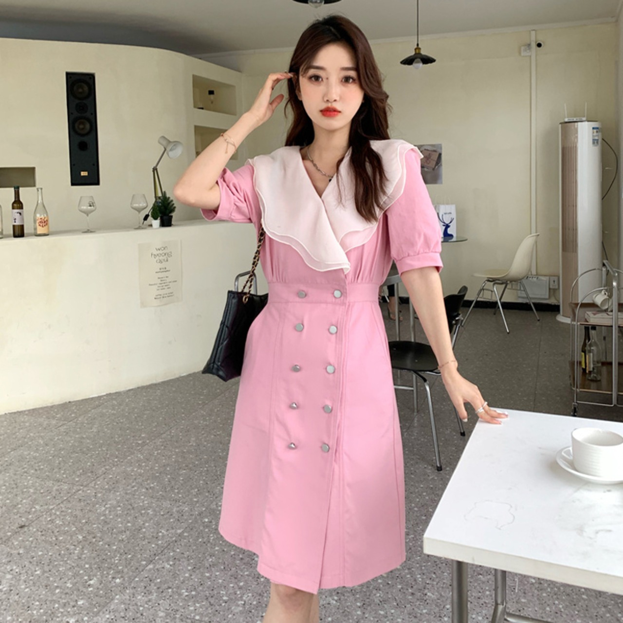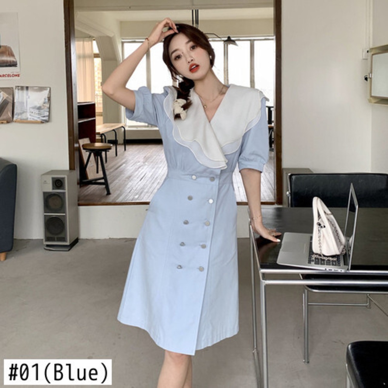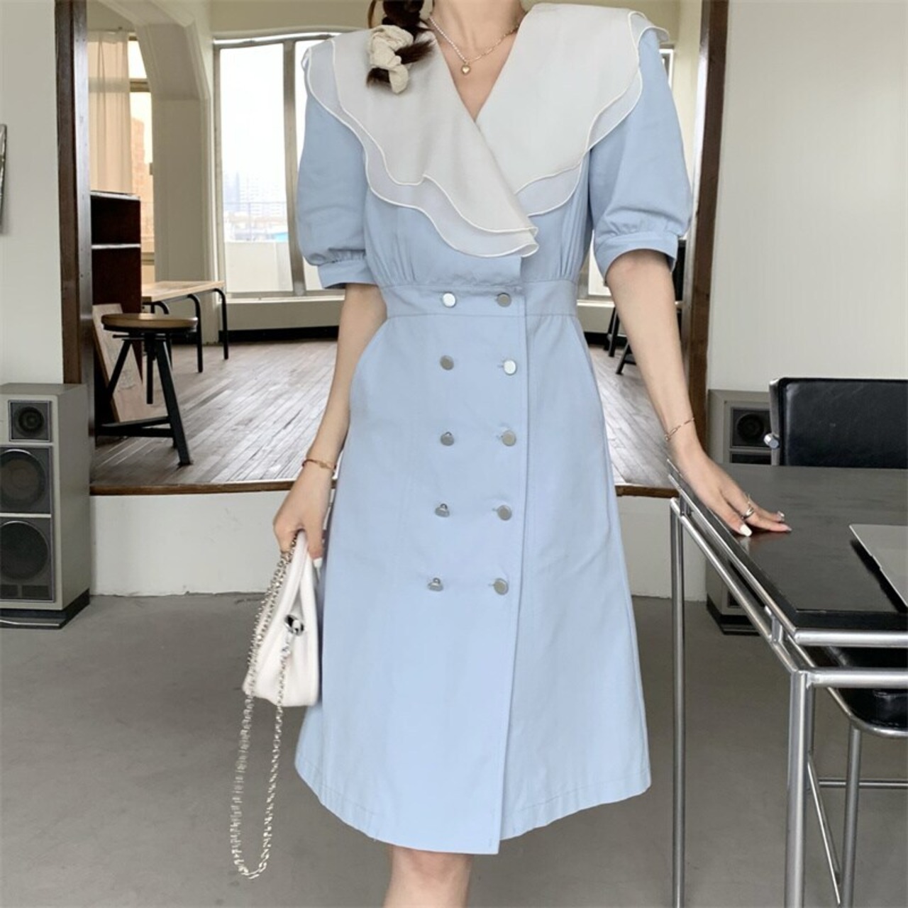 ノミクマウーマンドレスヒットカラーフリルパッチワークVネックジーンズワンピースダブルブレストスリムウエストデミンヴェスティドス kor73814806967