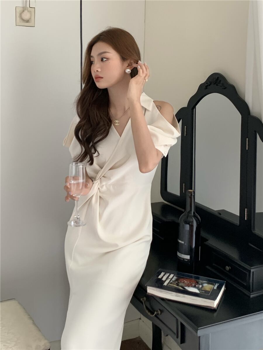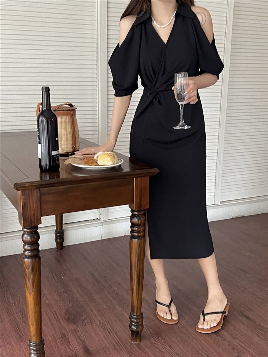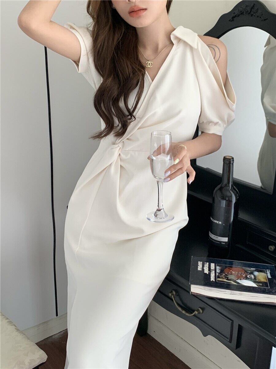 ノミクマVネックストラップレス半袖ドレス女性サマーツイストスリムウエストドレス2022スプリットヴェスティド ショート ハーフスリーブ 夏物 kor90590404298
