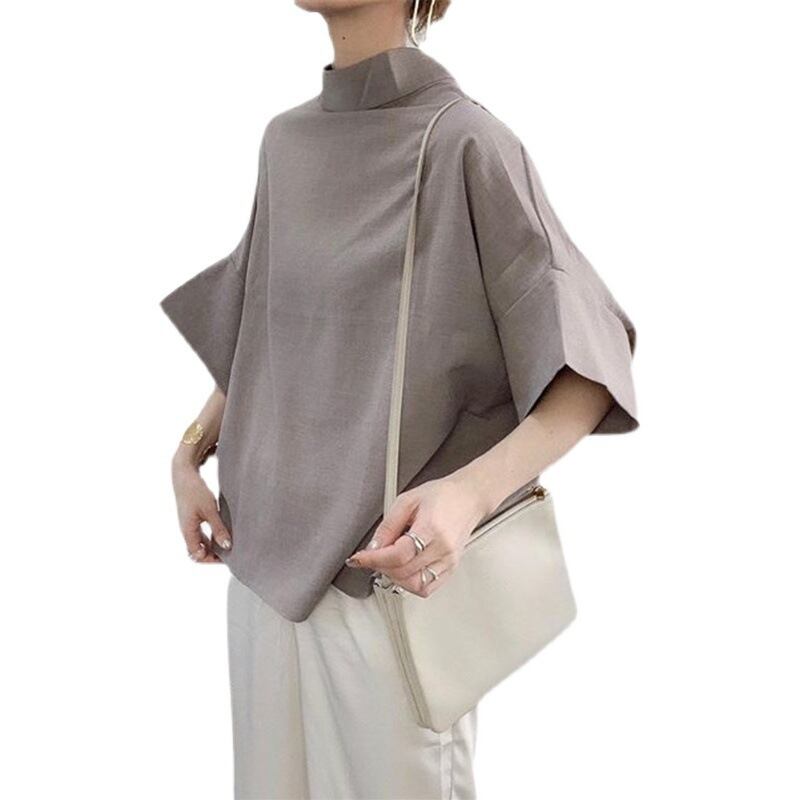 ノミクマ2022サマーブラウスレディースカジュアルハーフバットウィングスリーブスタンドネックシャツソリッドプルオーバートップス 夏物 ソリッドカラー kor9167212336