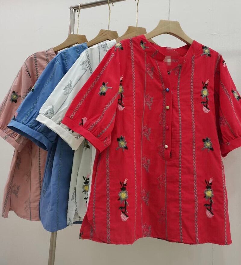 のみくま花刺繡ブラウスシャツサマーパフスリーブシングルブレストOネック2022シックスウィートレディーストップス 刺繍 大人ガーリー キュート カジュアル 夏物 花柄 kor87944130180