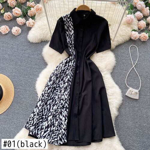 ノミクマフローラルパッチワークレディースブラウスドレスターンダウンカラースリムウエストサマードレス 夏物 花柄 kor55104190914