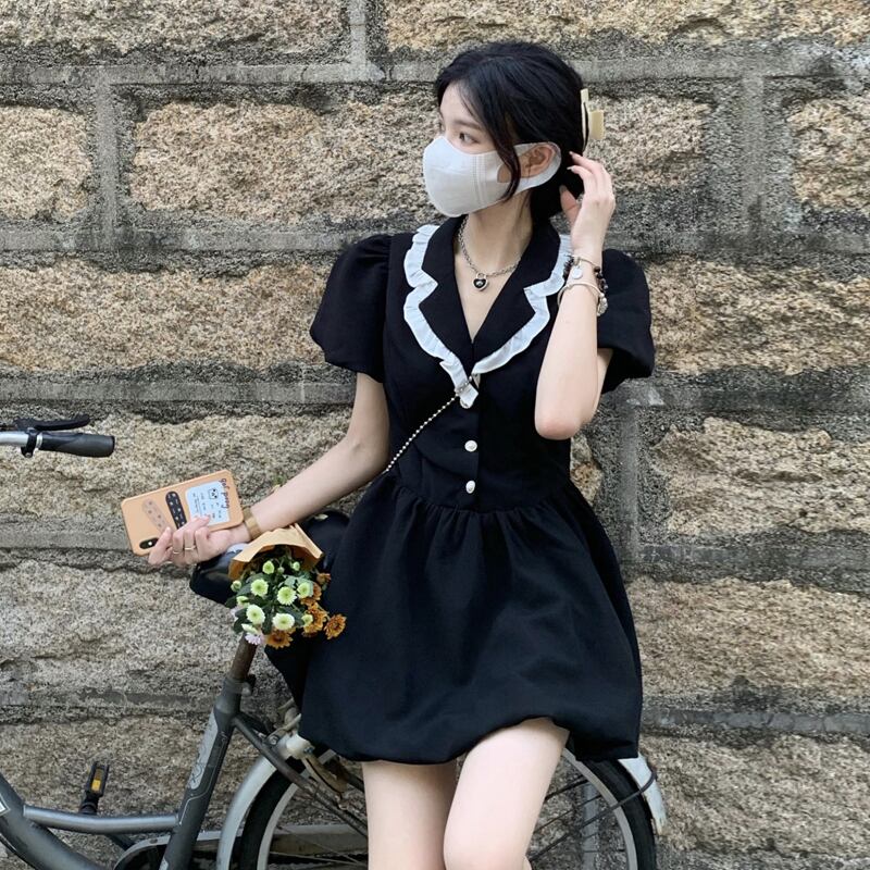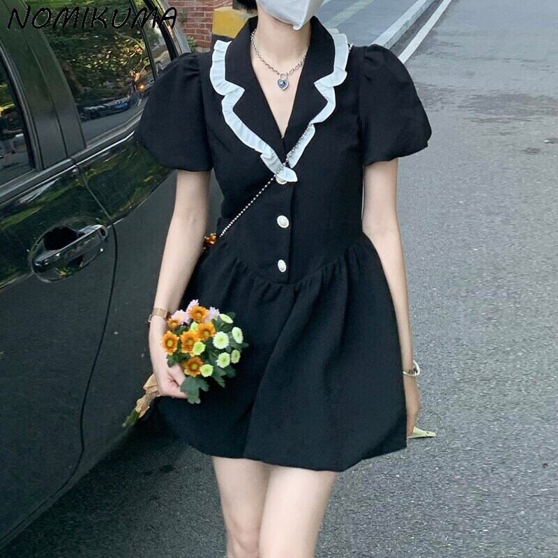のみくまウーマンドレスシックヒットカラーフリルパッチワークノッチカラーサマーパフスリーブウエストAラインワンピース 夏物 kor8334831204