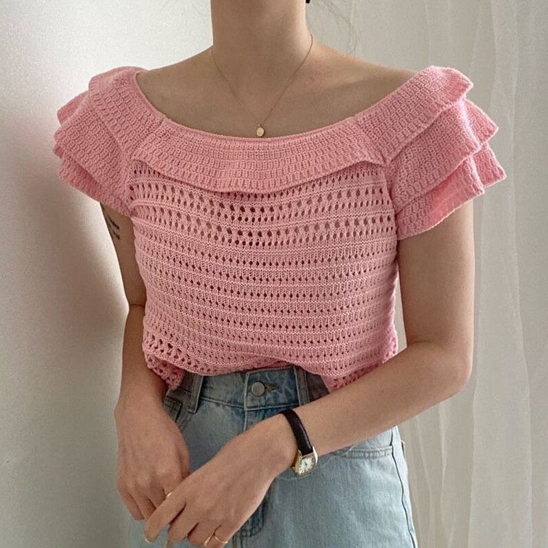 ノミクマシックサマーフライングスリーブオフショルダープルオーバーニット2022女性中空アウトシックショートニットセーター 夏物 kor68858713383