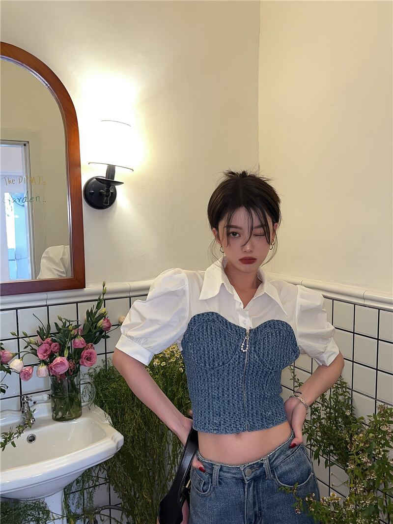のみくまデミンパッチワークレディーストップパフスリーブターンダウンカラーブラウス2022サマージッパースリムショートシャツ 夏物 kor18423715949